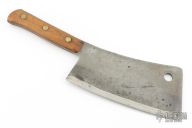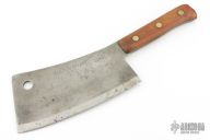 This vintage cleaver by Foster Bros features a large blade with the traditional hole at the tip, .241" blade stock and 4.239" blade depth, full tang construction. The handle has wood scales with brass pins. Has been used, has scratches and patina, has been resharpened, otherwise good condition for its age.