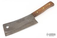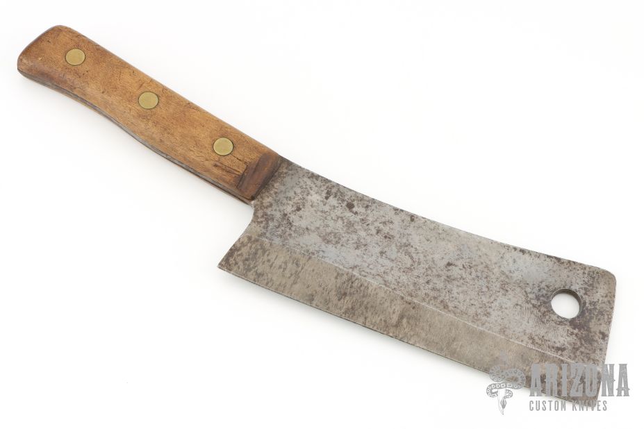 This vintage cleaver by Foster Bros features a large blade with the traditional hole at the tip, .203" blade stock and 3.227" blade depth, full tang construction. The handle has wood scales with brass pins. Has been used, has scratches and patina, has been resharpened, has some nicks in the edge, otherwise good condition for its age.