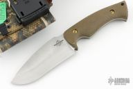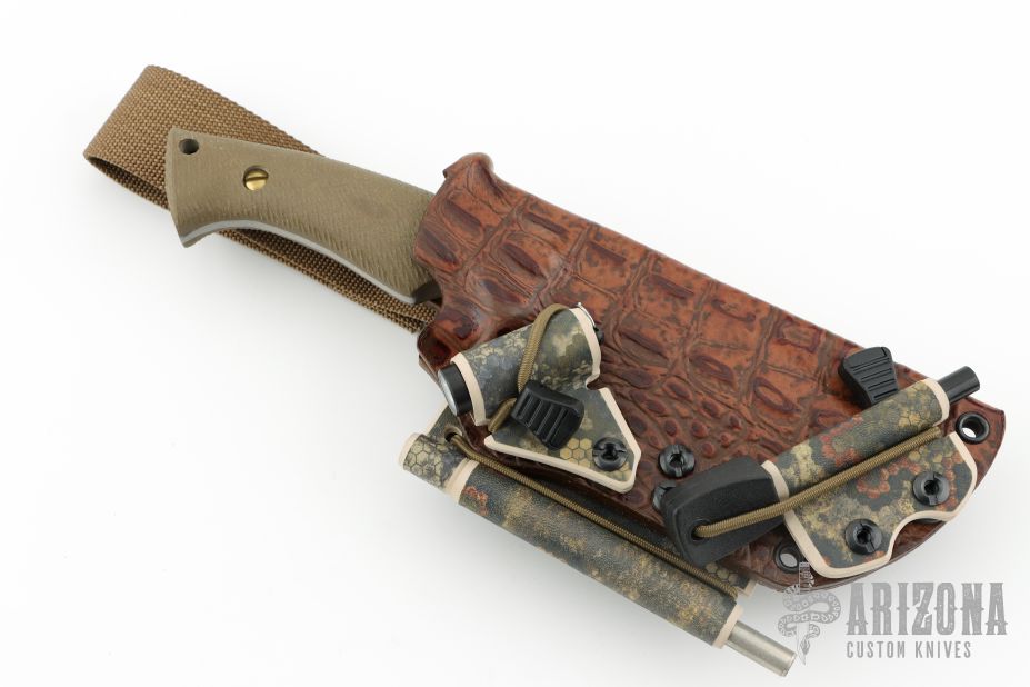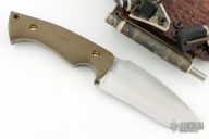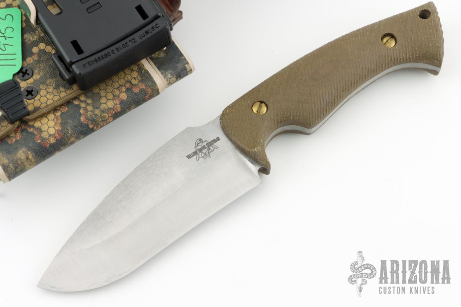 This Timbewrhawk by Yellow Hawk Customs features a satin finished blade with .189" blade stock and 1.762" blade depth, full tang construction. The handle has green canvas micarta scales. Comes with a custom leather over kydex sheath with flashlight, firesteel and sharpening steel. Has a couple light scratches, otherwise excellent condition.