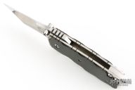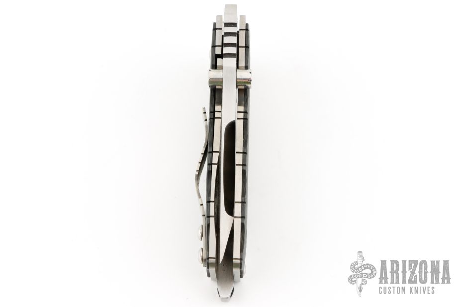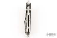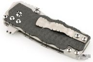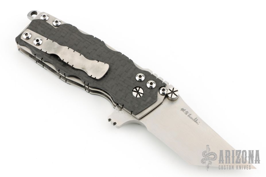 This Linerlock Flipper by Mike Franklin features a satin finished chisel ground blade with notched thumbrest, flipper and dual thumbstuds. The handle has carbon fiber scales, fileworked titanium liners, stainless steel backspacer with lanyard hole, tip up jeweled titanium clip. Nice detent, and lock and blade seating. Has some light scratches, otherwise excellent condition. Dated 4-05