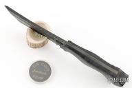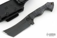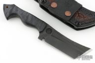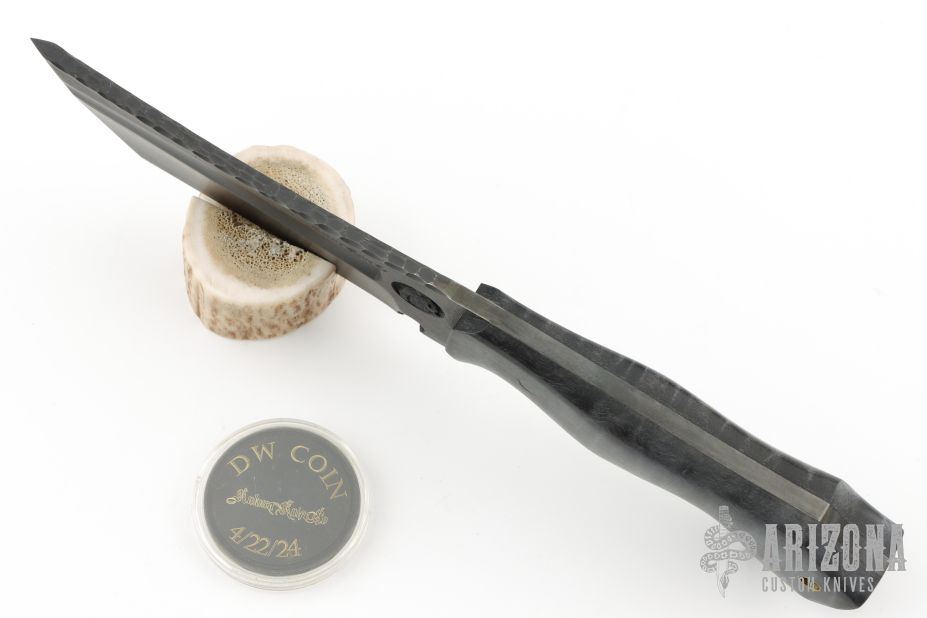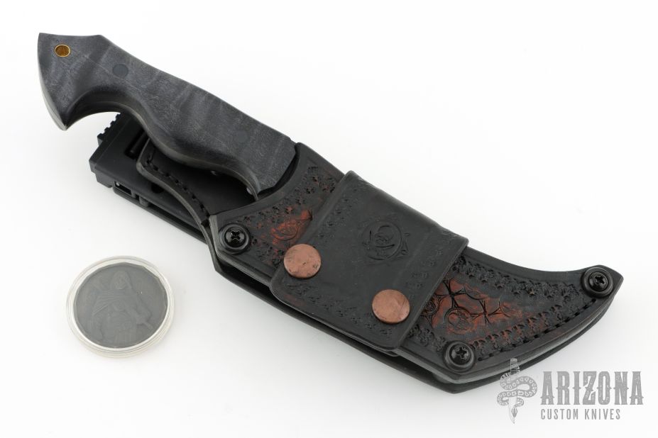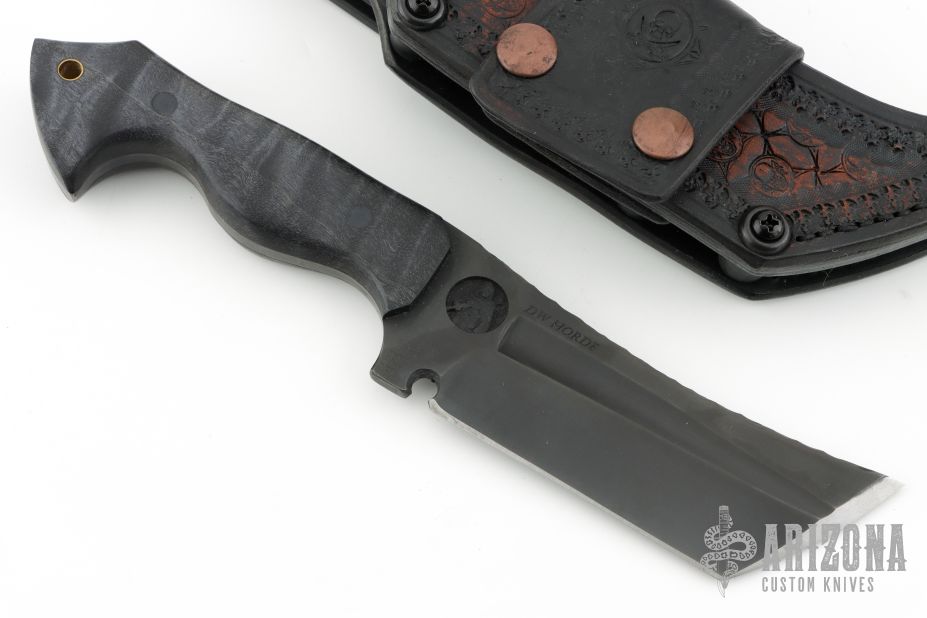 This Dark Woodsman Horde by Ankura Knife Co features a black oxide finished blade with fullers and a textured spine, .198" blade stock and 1.830" blade depth, full tang construction. The handle has Summit Woodblanks scales with black pins. Comes with a hand tooled brown leather sheath, challenge coin and a COA dated 4/22/24. Excellent condition.