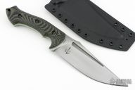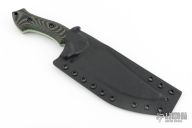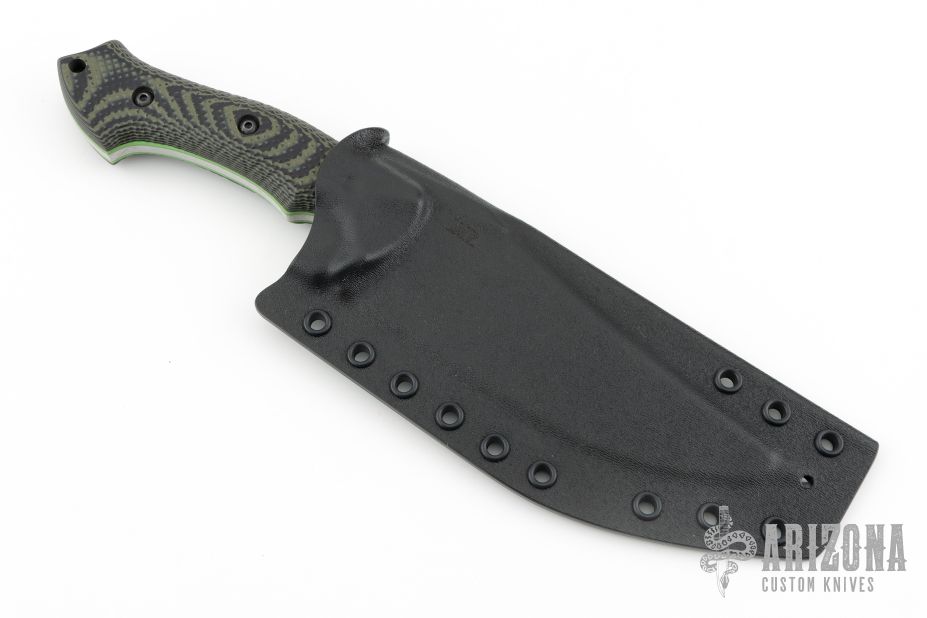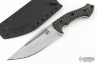This Blackout by Work Tuff Gear is an Ankura design, it features a satin finished SK85 steel blade with fullers, .188" blade stock and 1.970" blade depth, full tang construction. The handle has Swamp Camo Gator Grip G-10 scales with green G-10 liners. Comes with original box, extras and kydex sheath. Excellent condition.