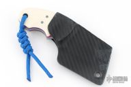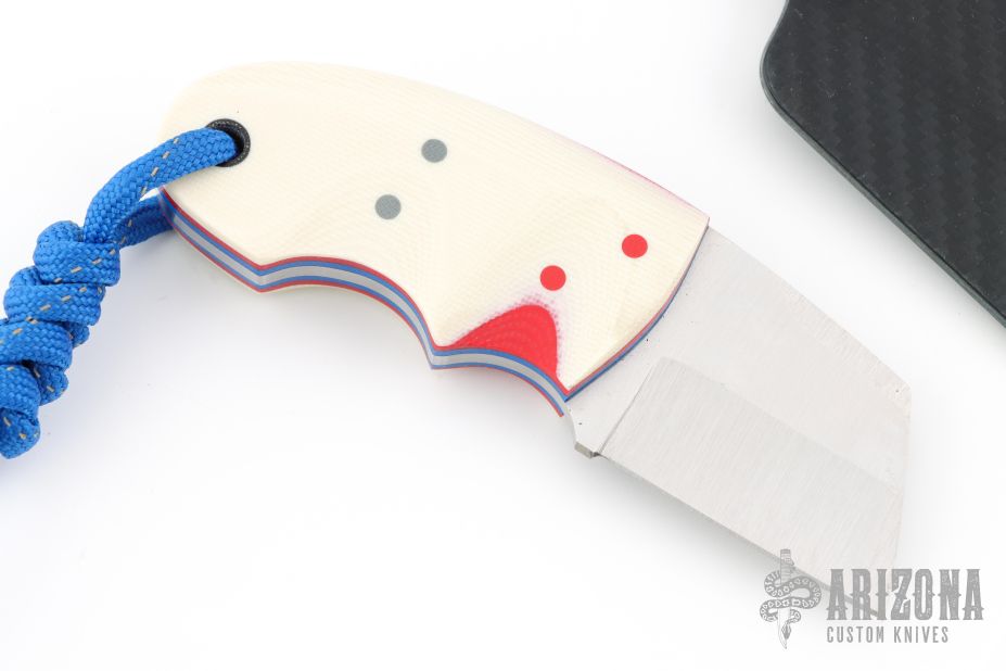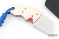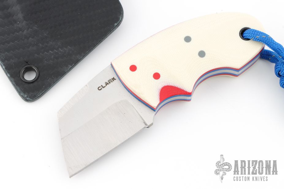 This knife by David Lancaster Clark features a satin finished blade with .139" blade stock and 1.319" blade depth, full tang construction. The handle has G-10 scales with red/blue liners. Comes with a kydex sheath. New from maker.