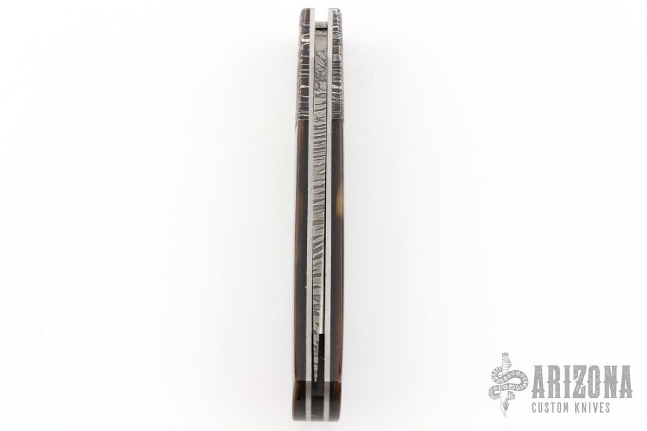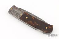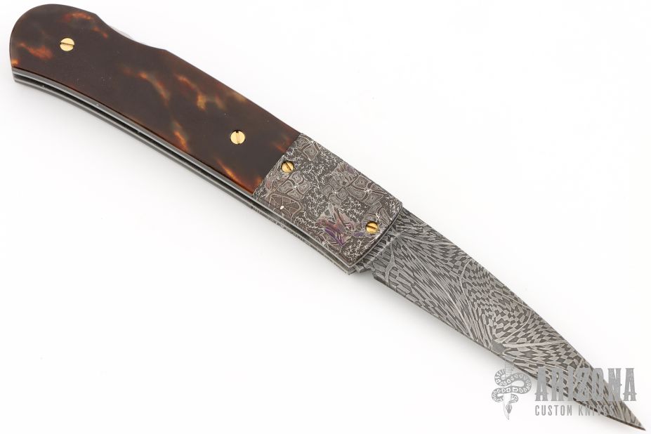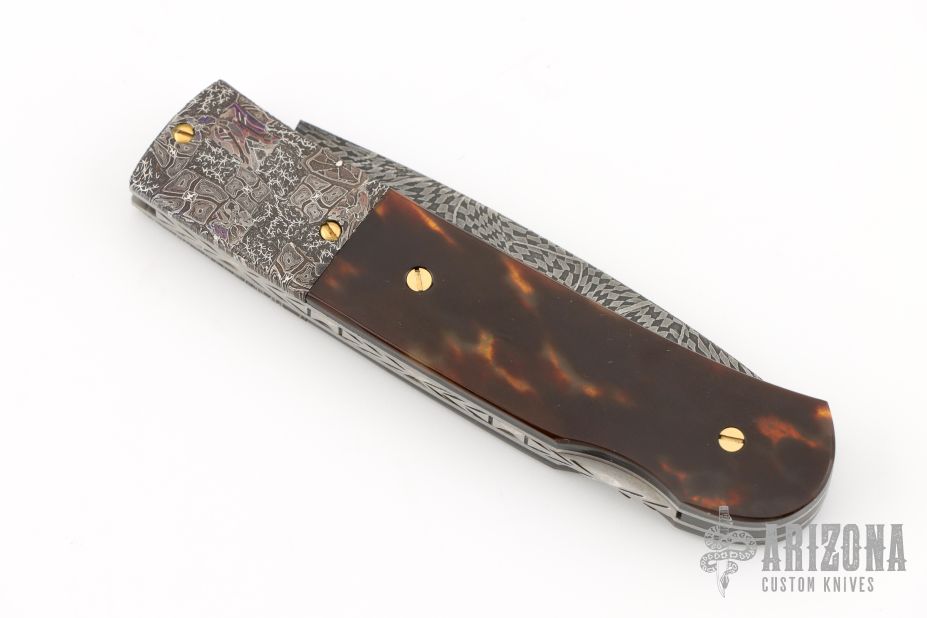 This Lockback by W.D. Pease features a Mosaic Damascus blade with a nail nick. The handle has Mosaic Damascus bolsters, stainless liners, file worked stainless backspacer, tortoise shell scales with gold screws. Excellent condition. Comes with a zippered case.