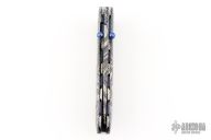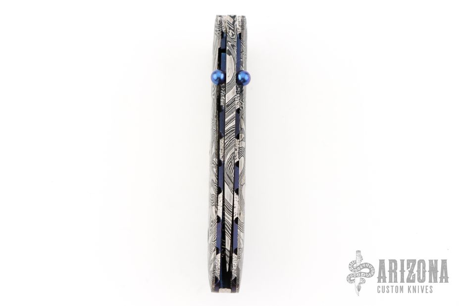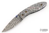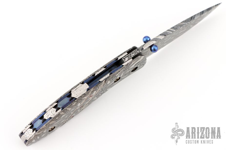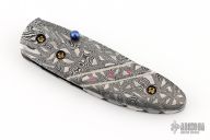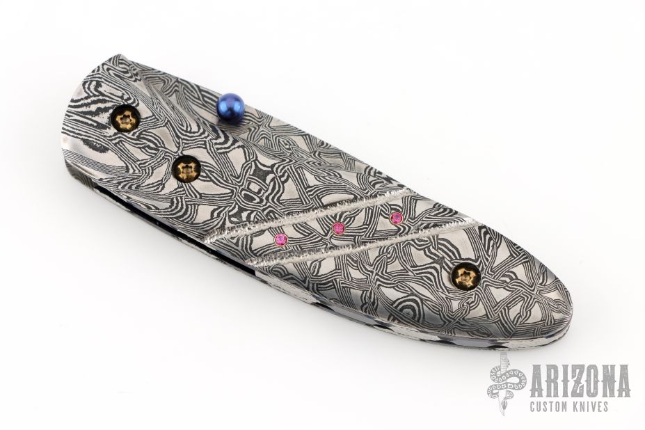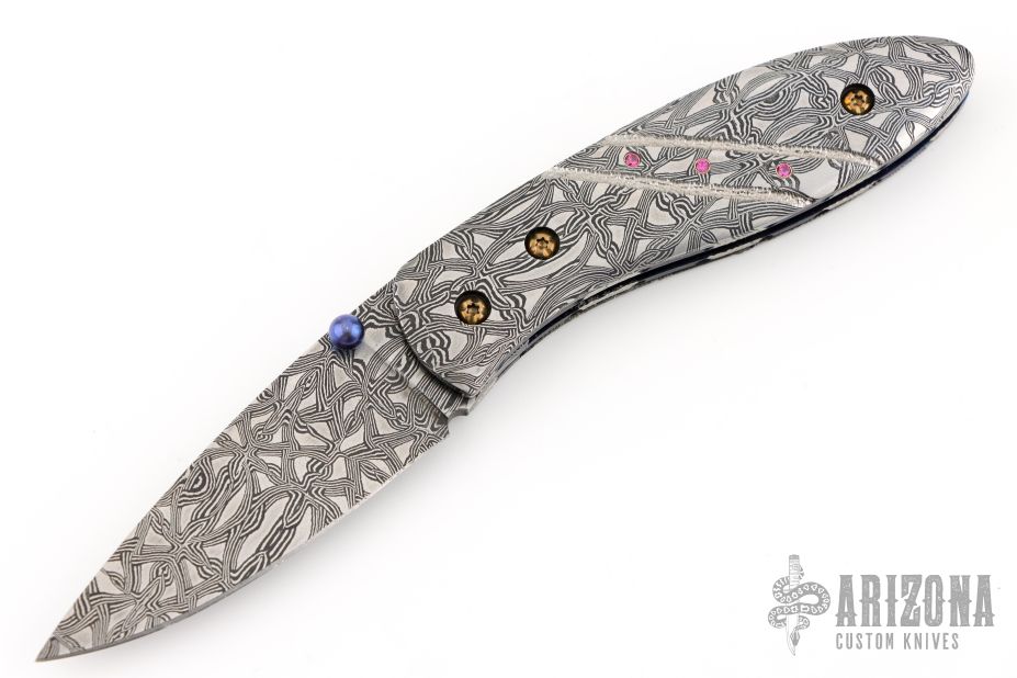 This linerlock folder by Master Smith Ed Caffrey features a Mosaic Damascus blade with dual anodized titanium thumbstuds. The handle has fluted mosaic Damascus scales with three pink rubies set in gold bezels on each side, blued and textured 15N20 steel liners with filework. Nice detent, lockup and blade seating. Excellent condition. Comes with a zippered case.