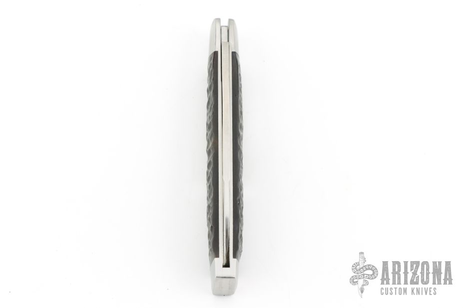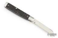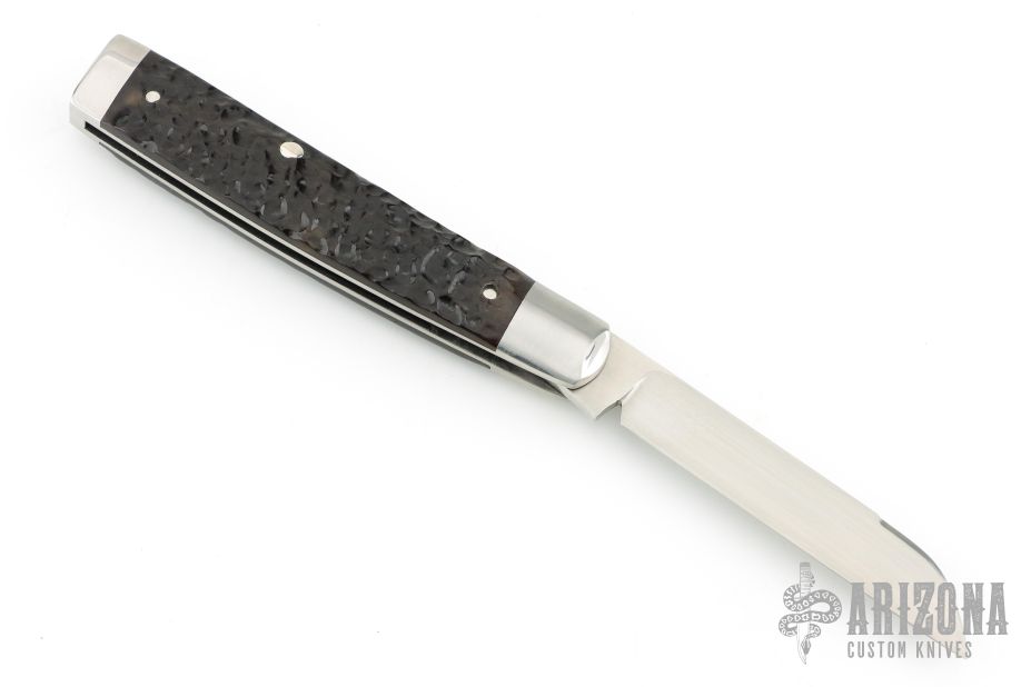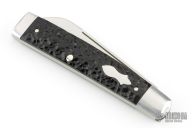 This slipjoint by Bobby Toole features a hand rub satin finished blade with long pull. The handle has pinched steel bolsters, jigged bone covers with stainless steel pins, stainless steel liners and  spring. Has half stop. Comes in a zipper case with COA/business card. Exellent condition.