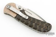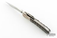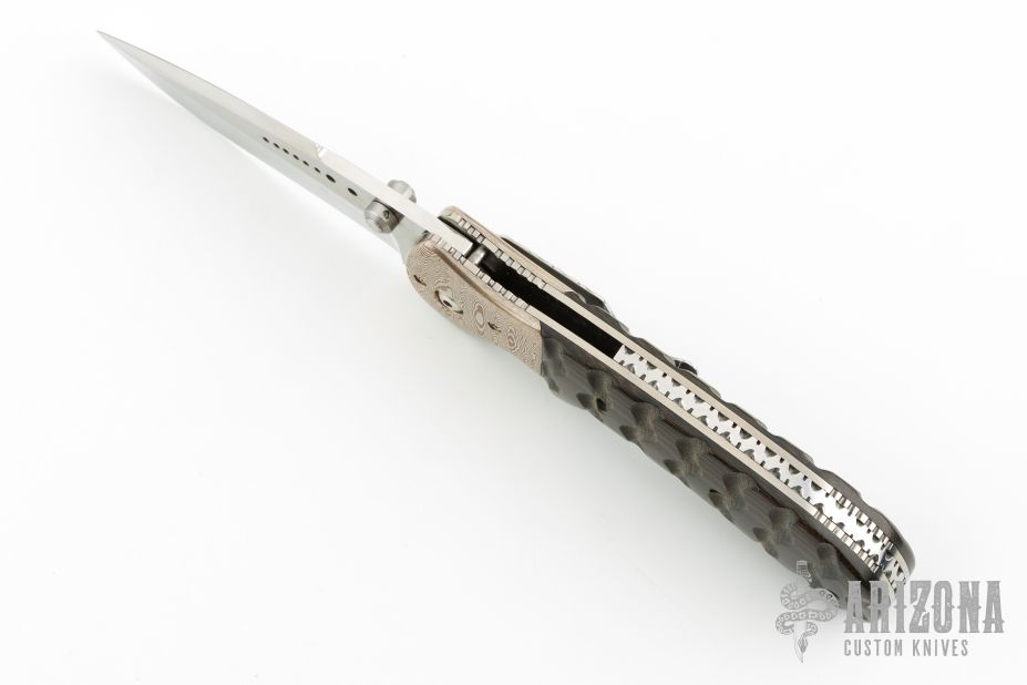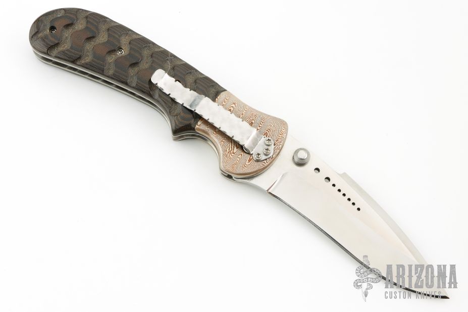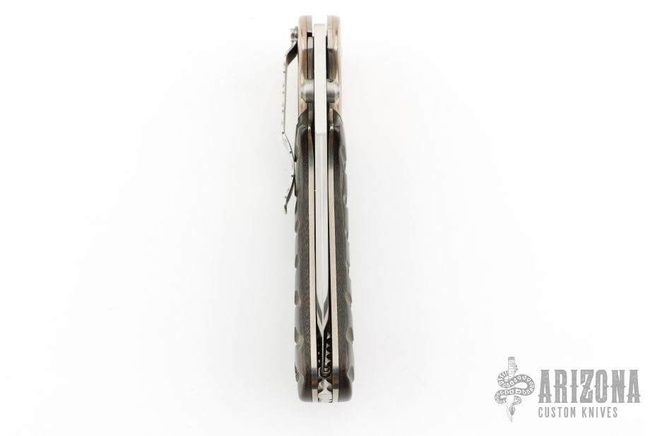 This Assisted Opening Folder by Crawford Knives features a satin finished blade with dual thumbstuds. The handle has dovetail mokume bolsters, black linen micarta scales, polished liners with jeweled interior, file worked stainless steel backspacer, and jeweled/file worked tip down stainless steel clip. Nice action, lockup and blade seating. Has a few light scuffs, otherwise excellent condition.
