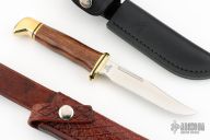 This Model 117 Brahma by Buck Knives features a satin finished clip point blade with false top edge and fullers, .117" blade stock and .788" blade depth, hidden tang construction. The handle has a brass guard and butt, and a wood grip. Comes with original black leather sheath and original box. Listing also includes a hand-tooled leather belt sheath. Excellent condition.