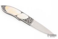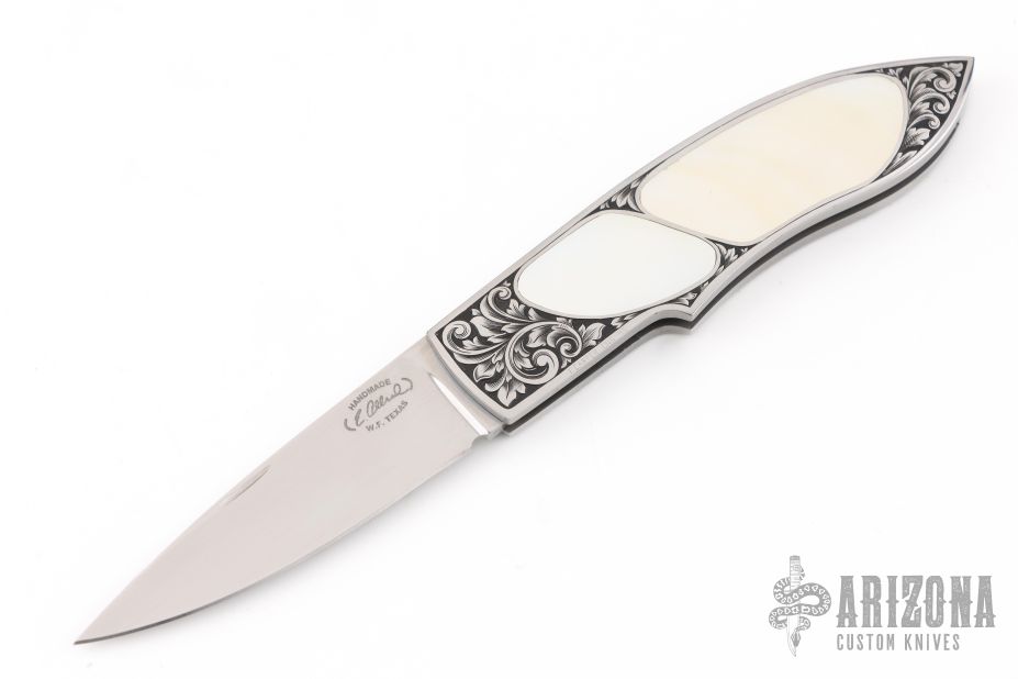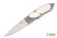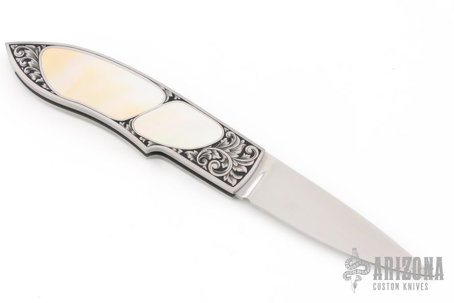 This Interframe Lockback by Elvan Allred features a hand rub satin finished blade with nail nick. The handle has an engraved stainless steel frame, gold lip pearl inlays and stainless steel backspacer. Engraved by Fred Carter and dated '95. Nice lockup and blade seating. Excellent condition. Very elegant piece. Comes with a zippered case.