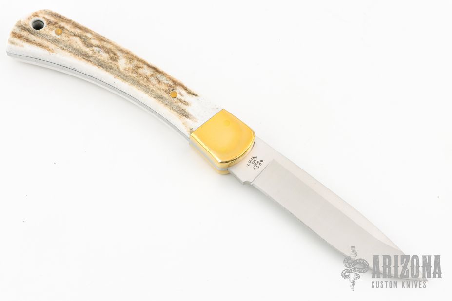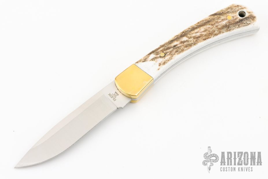 This Model 113 Ranger Skinner by Buck Knives features a satin finished drop point blade with .119" blade stock and .797" blade depth, full tang construction. The handle has brass bolsters, and pinned elk antler scales. Comes with original brown leather sheath, box, and papers. Excellent condition. 1/200 for the Buck Collecter's Club International.