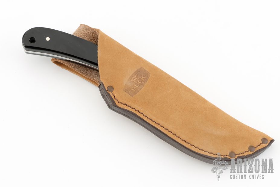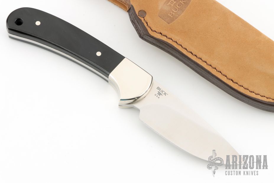 This Model 113 Ranger Skinner by Buck Knives features a satin finished BOS heat treat drop point blade with .118" blade stock and 1.106" blade depth, full tang construction. The handle has nickel silver bolsters, and pinned water buffalo horn scales. Comes with original brown leather sheath, box, and papers. Excellent condition.