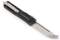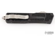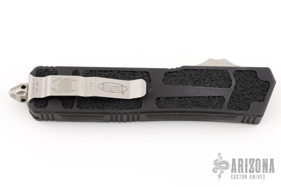 This Scarab II by Microtech features a stonewash finished blade with fullers. The handle has a black aluminum handle with non-slip inserts, a single glass breaker and tip down stainless steel clip. Comes with original box and papers. Has a light scuff on the edge of the frame, otherwise excellent condition.