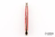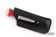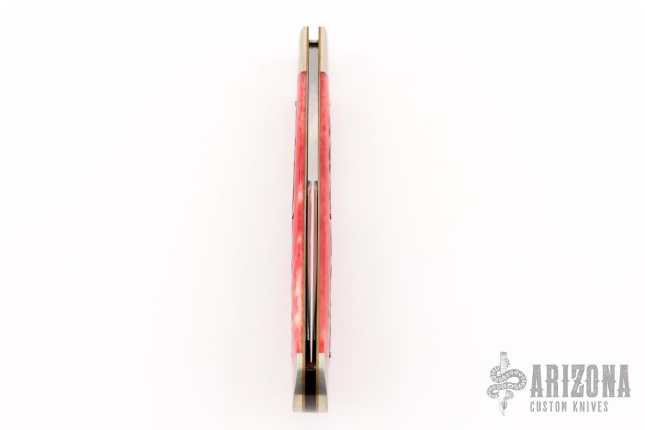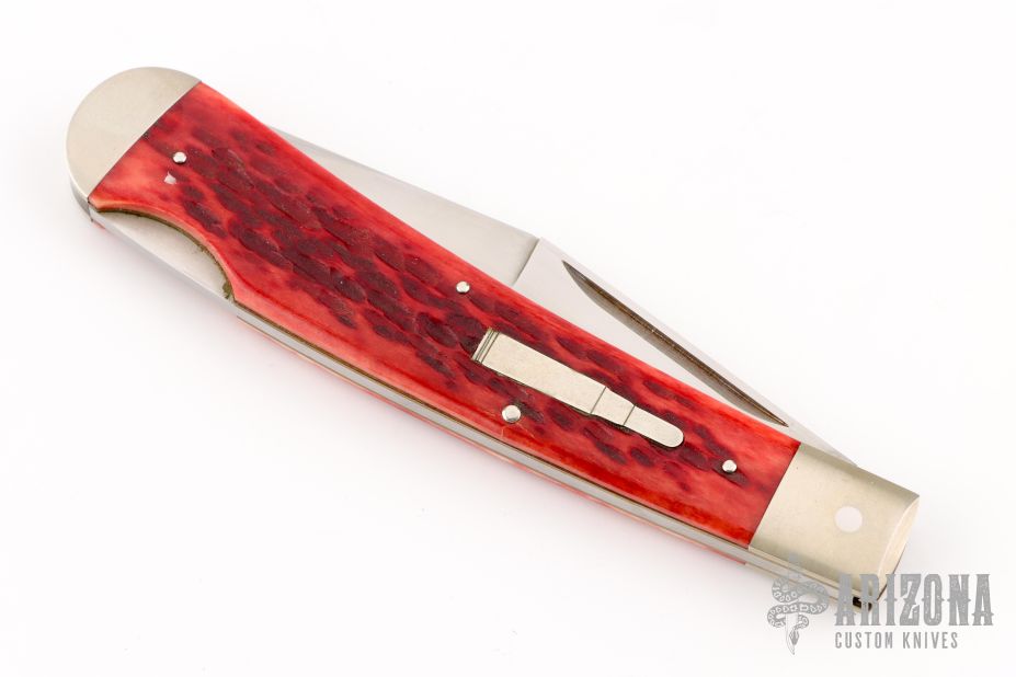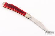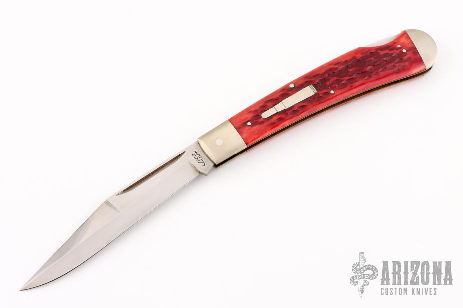 This Lockback by Jess Horn features a hand rub satin finished clip point blade with nail nick, has a rounded blade spine on the clip. The handle has satin finished nickel silver bolsters and liners, red jigged bone scales, nickel silver bullet escutcheon. Flush lockup and nice blade seating. Comes with a leather zippered case. #135 on blade. Has a few light scratches, otherwise excellent condition.