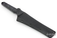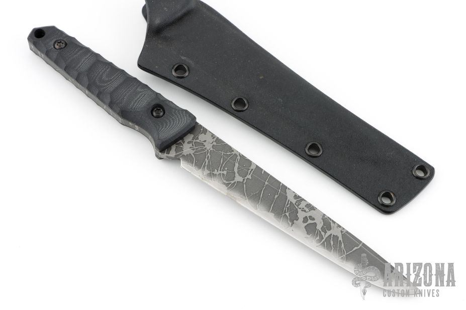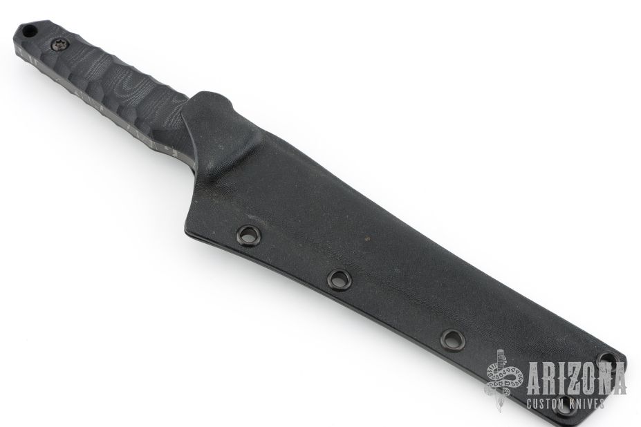 This knife by Kiku Matsuda features an acid etched blade with false top edge with notched thumbrest, .209" blade thickness and 1.017" blade depth, full tang construction. The handle has black G-10 scales. Comes with kydex sheath.  Excellent Condition.