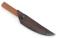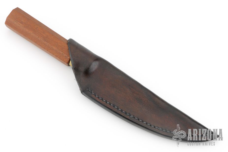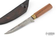 This knife by Will Griffin features a hand forged blade with a very thin razor sharp blade, .166" blade stock and .860" blade depth, hidden tang construction. The handle has a hammered brass collar with a wood grip with a nice rounded handle.  The handle is from an abandoned teak schooner. Comes with a brown leather sheath.  Excellent Condition.