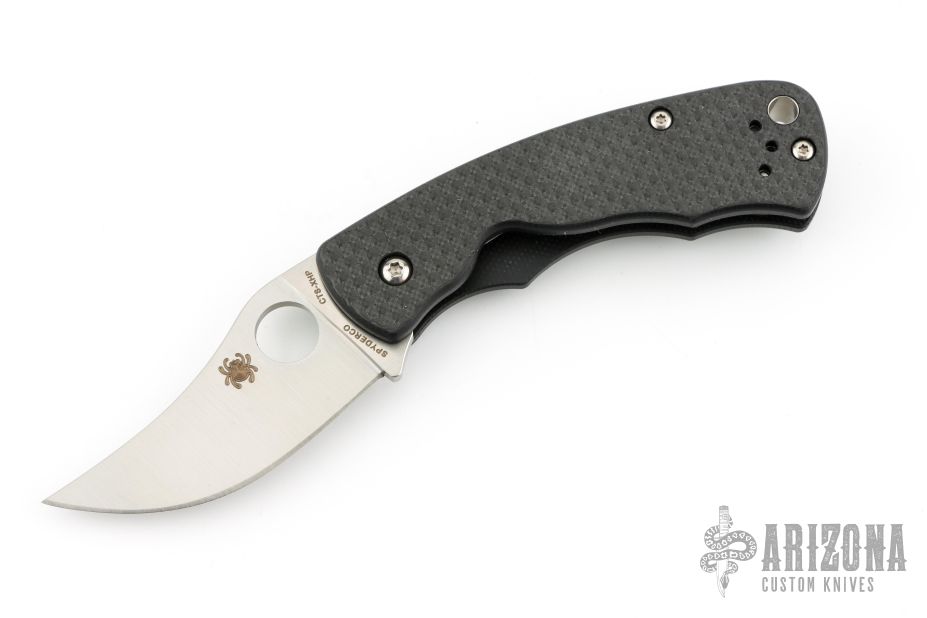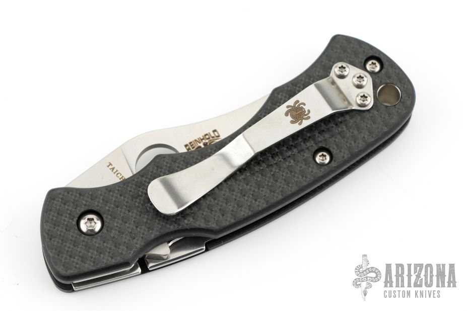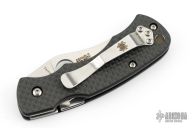 This Rhino by Spyderco is a Reinhold design, it features a satin finished blade with thumbhole. The handle has carbon fiber scales with an inlaid stainless steel liner that releases from the spine, tip up reversible stainless steel clip. Comes with original box and papers. New condition.