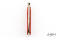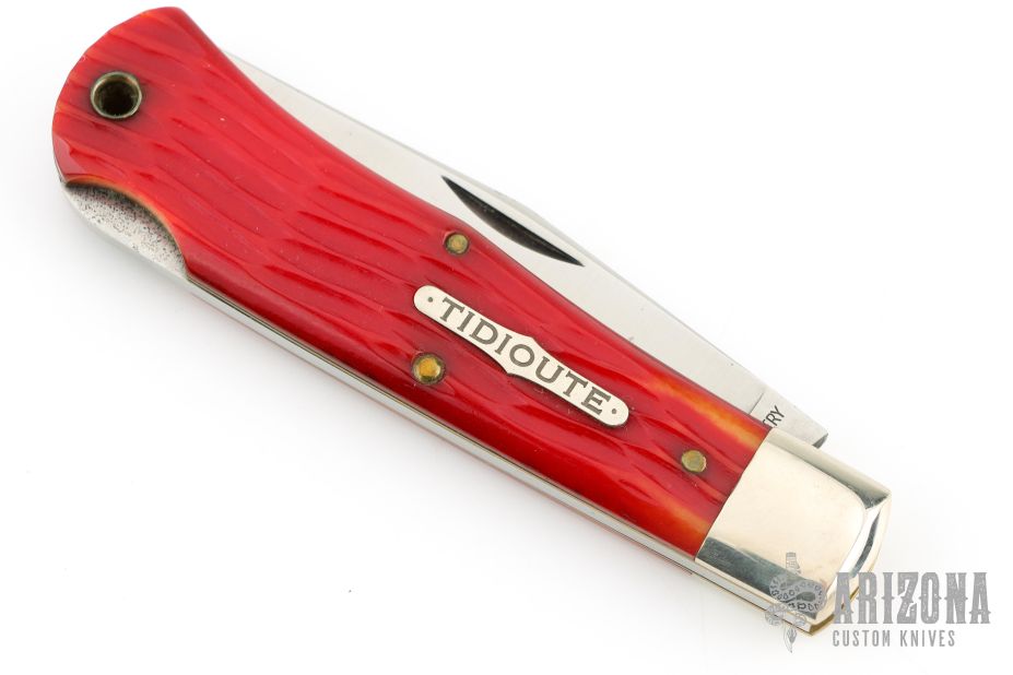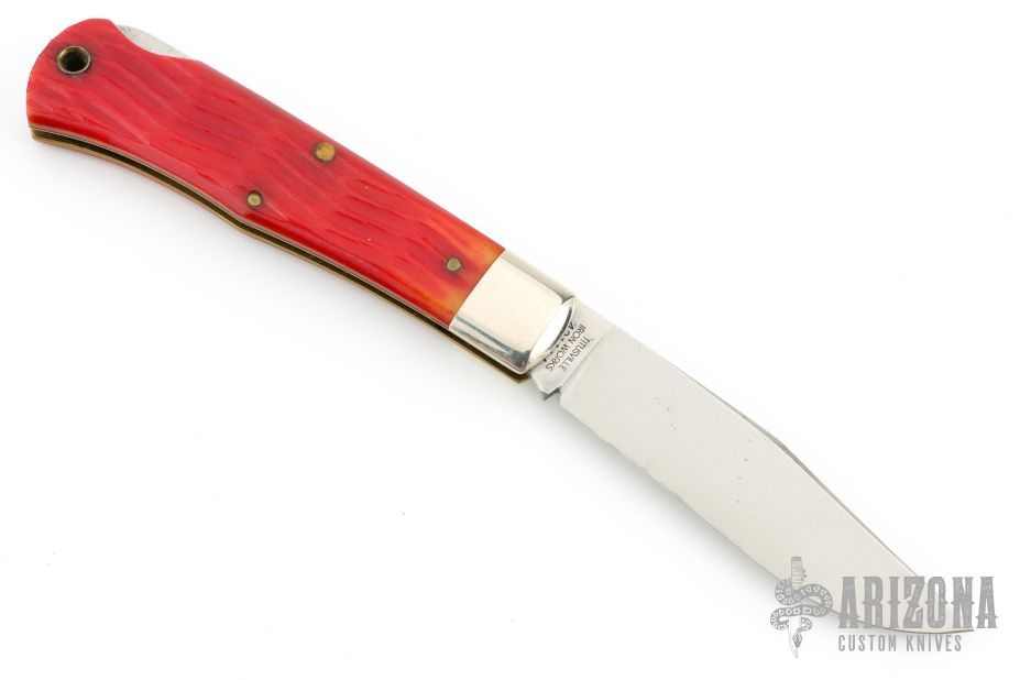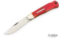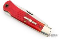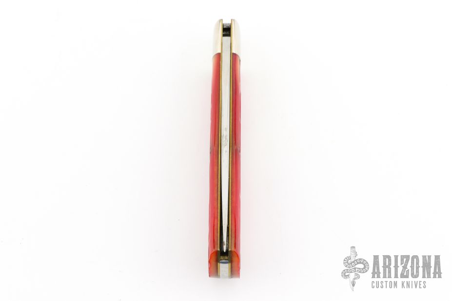 This knife by Great Eastern Cutlery features a satin finished clip point blade with nail nick. The handle has nickel silver bolsters and red jig bone covers and brass pins/liners, and steel backspring. Includes original cardboard tube and wax paper. Has some light scuffs and scratches, great condition otherwise.