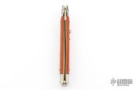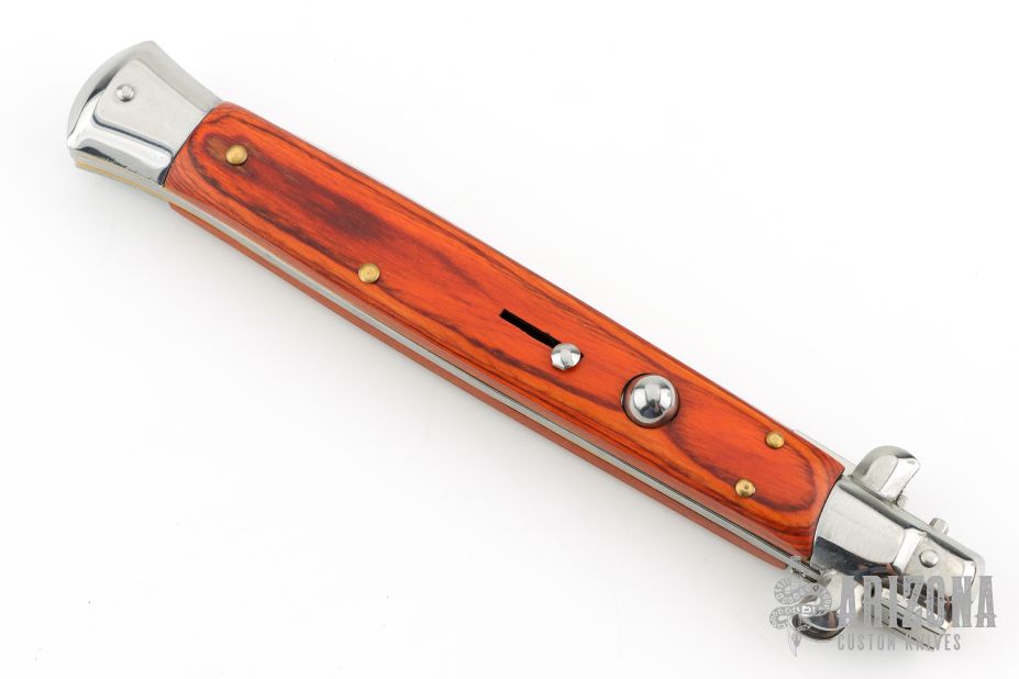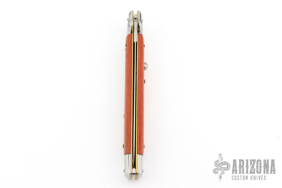 This 13" swivel bolster features a polished dagger ground blade. The handle has stainless steel bolsters, front and rear, wood scales, brass liners, stainless spring. Excellent condition. Comes with original box.