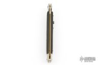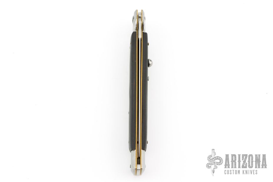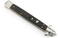 This 13" swivel bolster features a polished dagger ground blade. The handle has stainless steel bolsters, front and rear, black wood scales, brass liners, stainless spring. Excellent condition. Comes with original box.