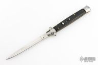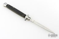 This 13" swivel bolster features a polished dagger ground blade. The handle has stainless steel bolsters, front and rear, black composite scales, brass liners, stainless spring. Excellent condition. Comes with original box.