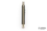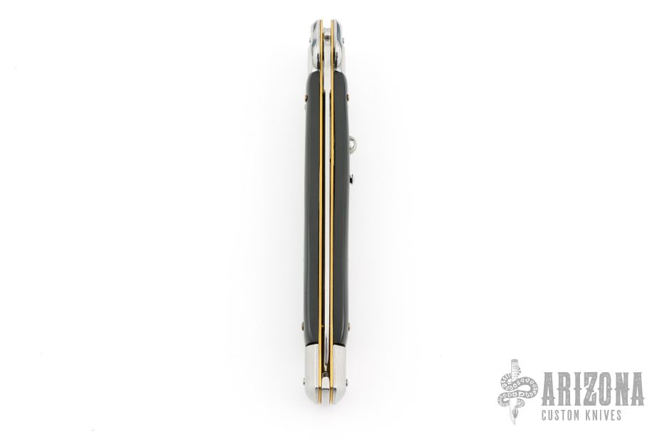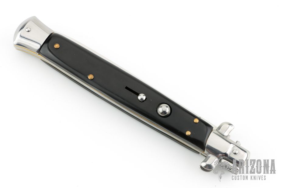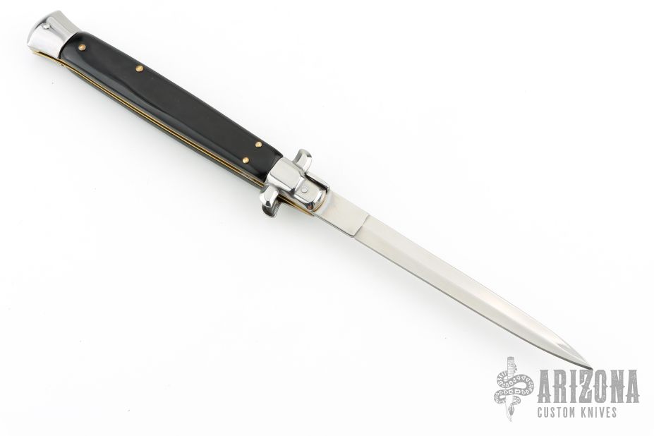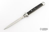 This 13" swivel bolster features a polished dagger ground blade. The handle has stainless steel bolsters, front and rear, black composite scales, brass liners, stainless spring. Excellent condition. Comes with original box.