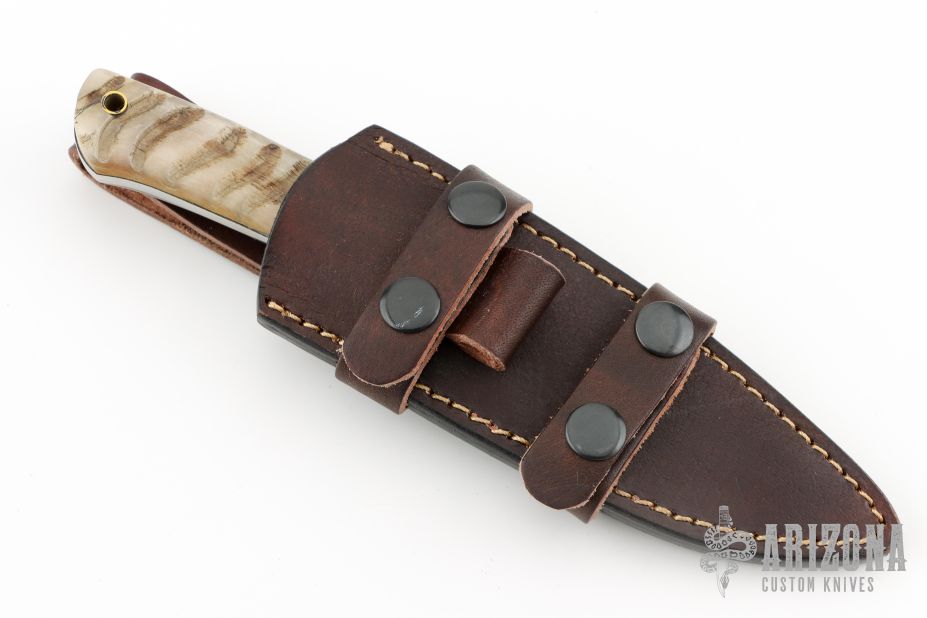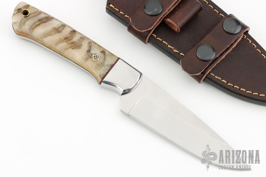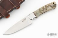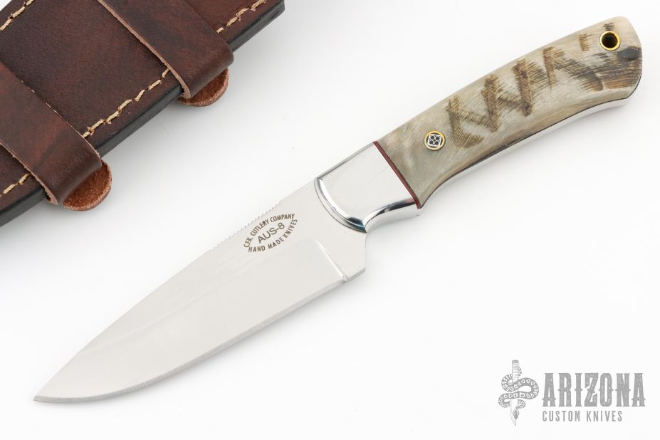 This knife by CFK Cutlery Company features a satin finished blade with a notched thumbrest, .164" blade stock and 1.342" blade depth, full tang construction. The handle has polished steel bolsters, bone scales, fileworked tang spine. Comes with a brown leather sheath. Excellent condition.