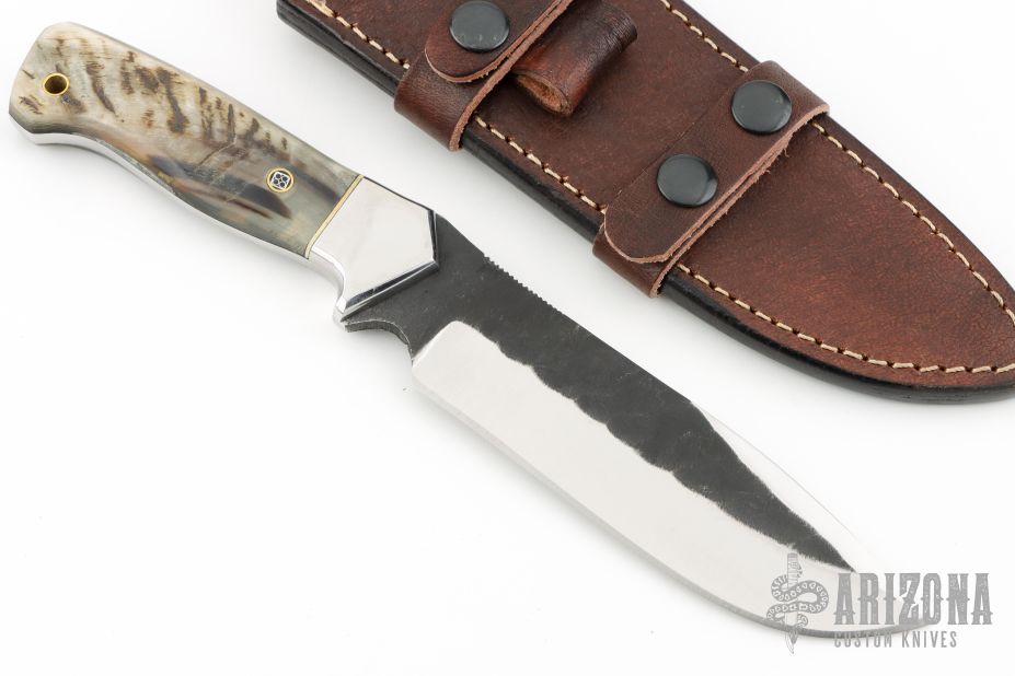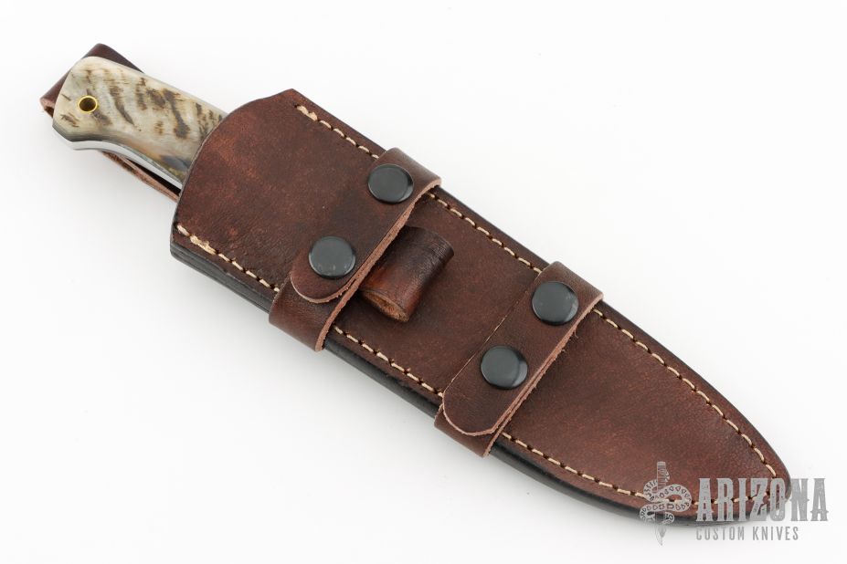 This knife by CFK Cutlery Company features a satin finished blade with black flats, a notched thumbrest, .175" blade stock and 1.493" blade depth, full tang construction. The handle has polished steel bolsters, bone scales, fileworked tang spine. Comes with a brown leather sheath. Excellent condition.