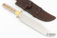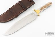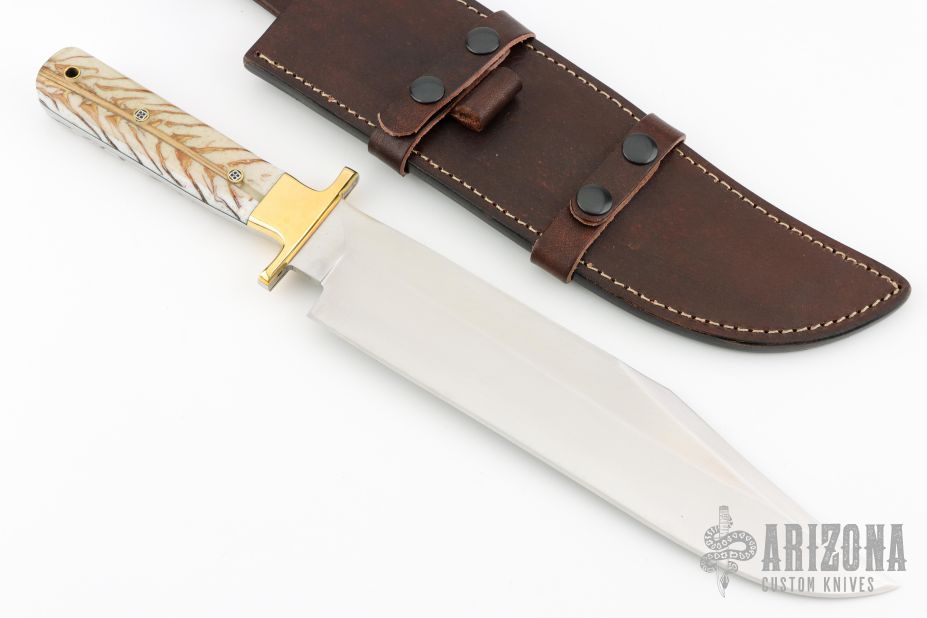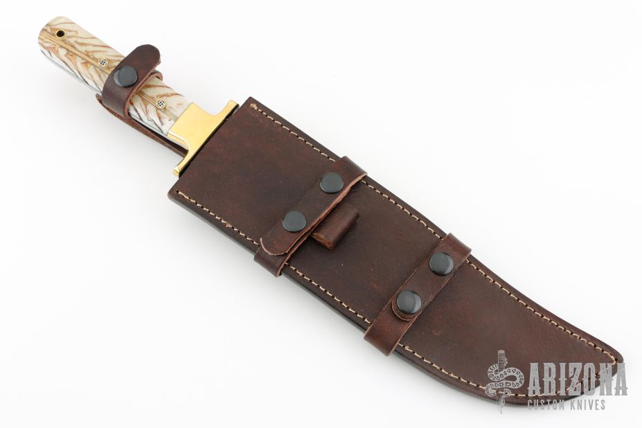 This knife by CFK Cutlery Company features a satin finished blade with .165" blade stock and 2.043" blade depth, full tang construction. The handle has polished brass bolsters/guard, acrylic scales, fileworked tang spine. Comes with a brown leather sheath. Excellent condition.