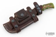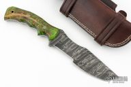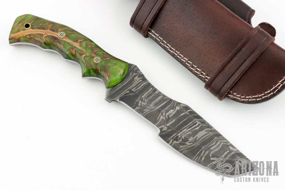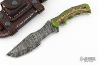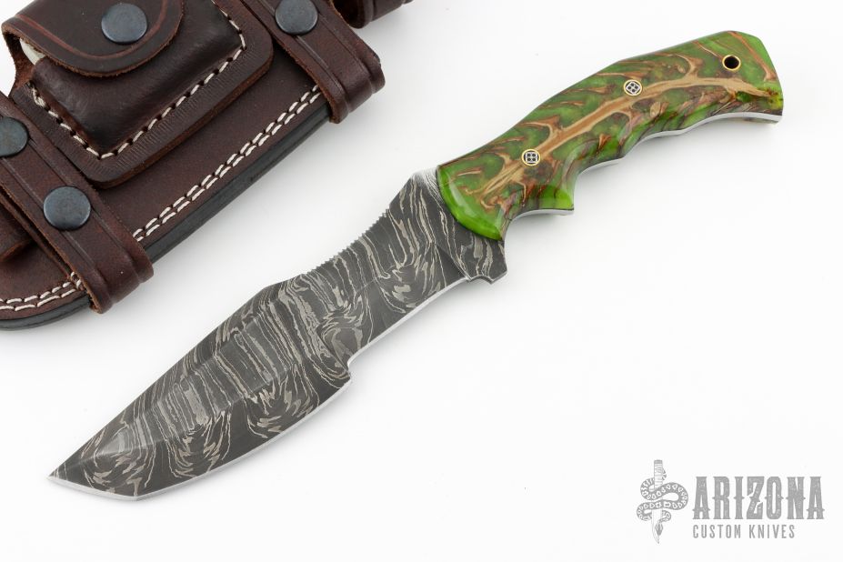 This knife by CFK Cutlery Company features a Damscus Multi-Ground tanto blade with .140" blade stock and 1.77" blade depth, full tang construction. The handle has acrylic scales, and fileworked tang spine. Comes with a brown leather sheath. Excellent condition.