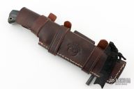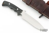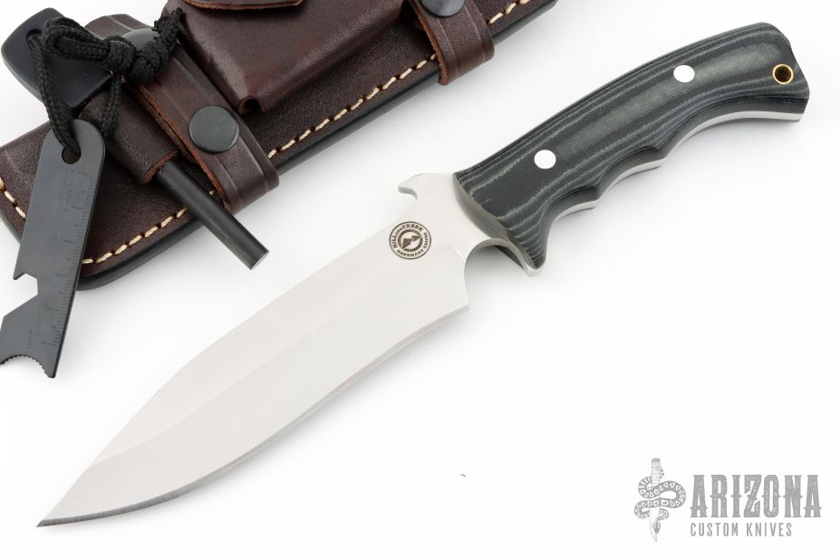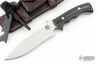 This knife by CFK Cutlery Company features a satin finished blade with a parry guard, .176" blade stock and 1.399" blade depth, full tang construction. The handle has green canvas micarta scales with aluminum pins, and brass lanyard hole at the butt. Comes with a brown leather sheath. Excellent condition.