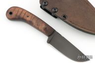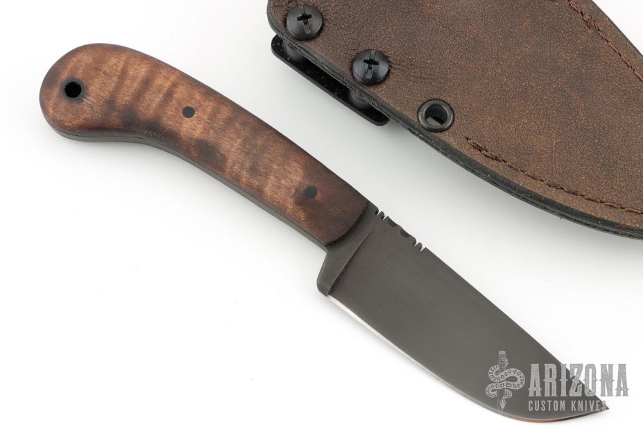 This knife features a non-glare Caswell finished drop point blade with a file-worked blade spine and full tang construction.  .161" Blade stock.  1.087" Blade Depth.  The handle has premium maple scales.  Includes the original brown leather sheath, box and papers.  Excellent Condition.