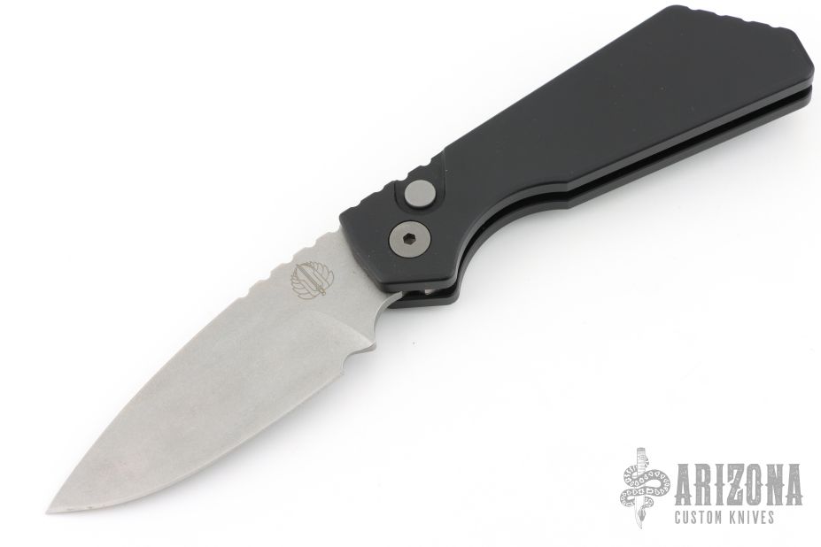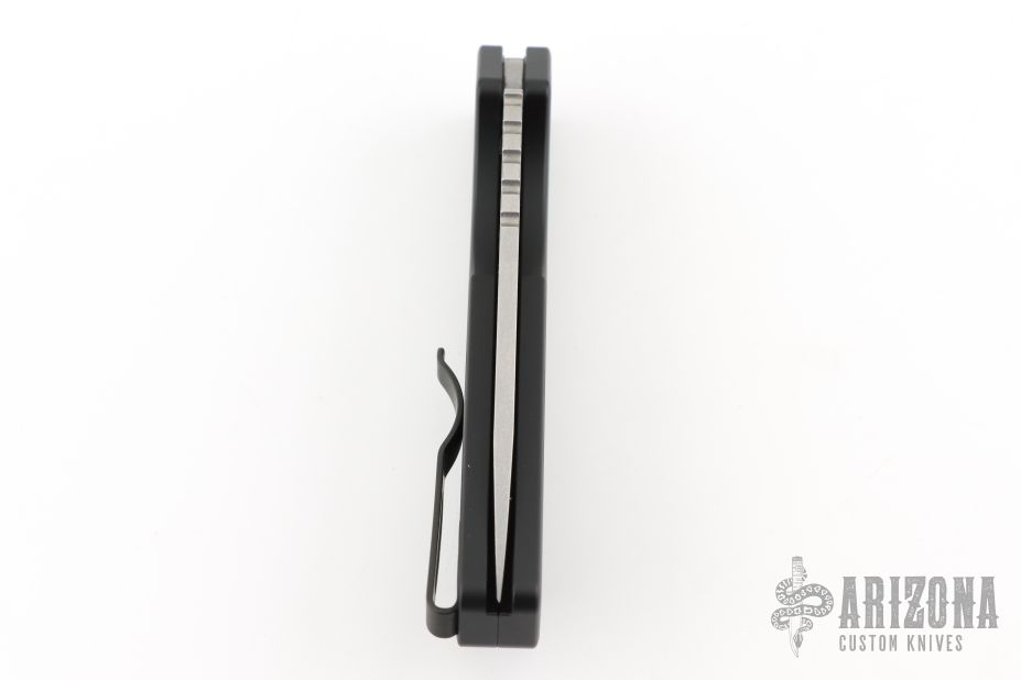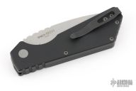 This Pro-Strider PT by Pro-Tech and Strider Knives features a tumbled finished blade with notched thumbrest. The handle has a black aluminum frame with bead blasted hardware and black stainless steel tip up clip. Includes the original box and papers. Excellent condition.