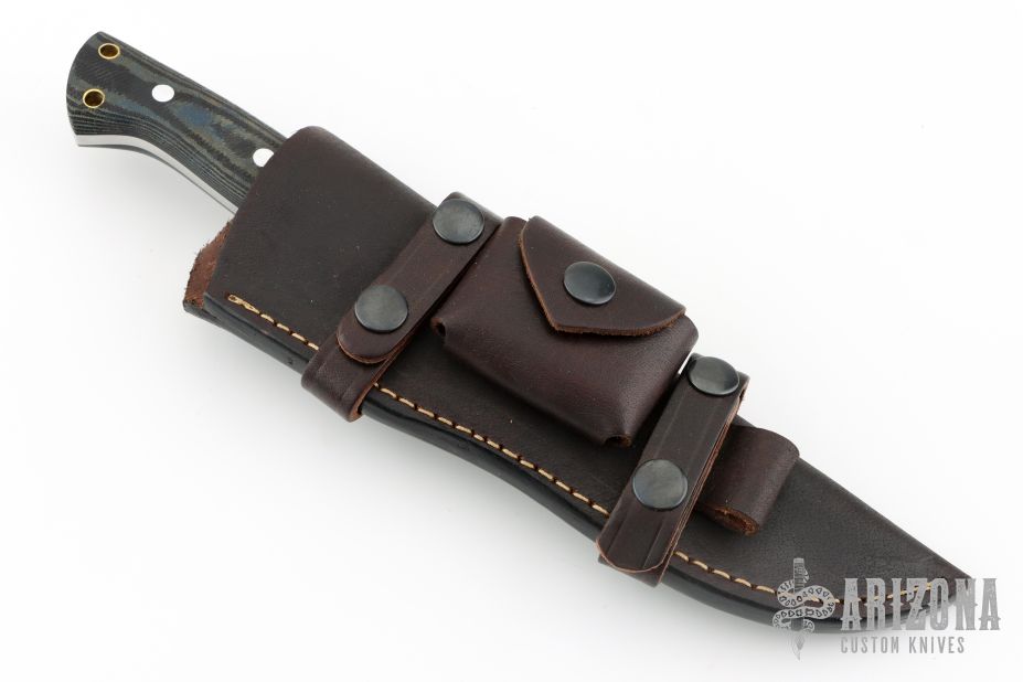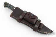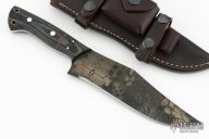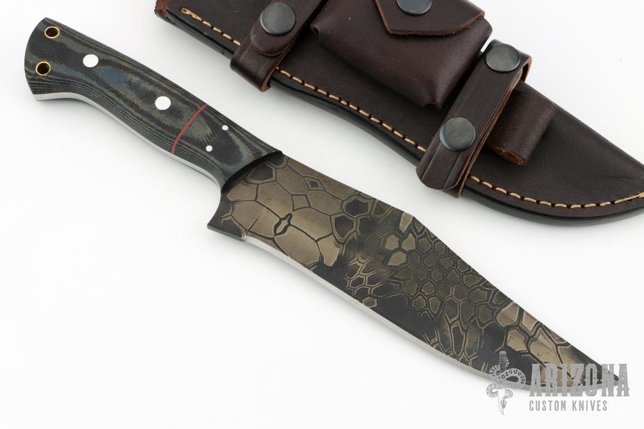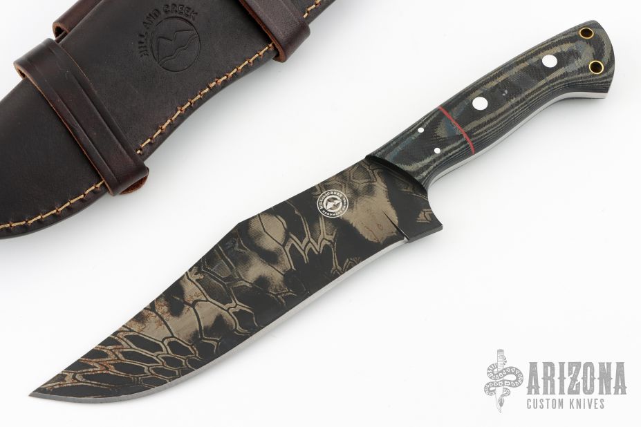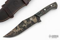 This knife by CFK Cutlery Company features a kryptek finished blade with false top edge, .177" blade stock and 1.821" blade depth, full tang construction. The handle has green canvas micarta scales with aluminum pins, and brass lanyard hole at the butt. Comes with a brown leather sheath. Excellent condition.