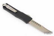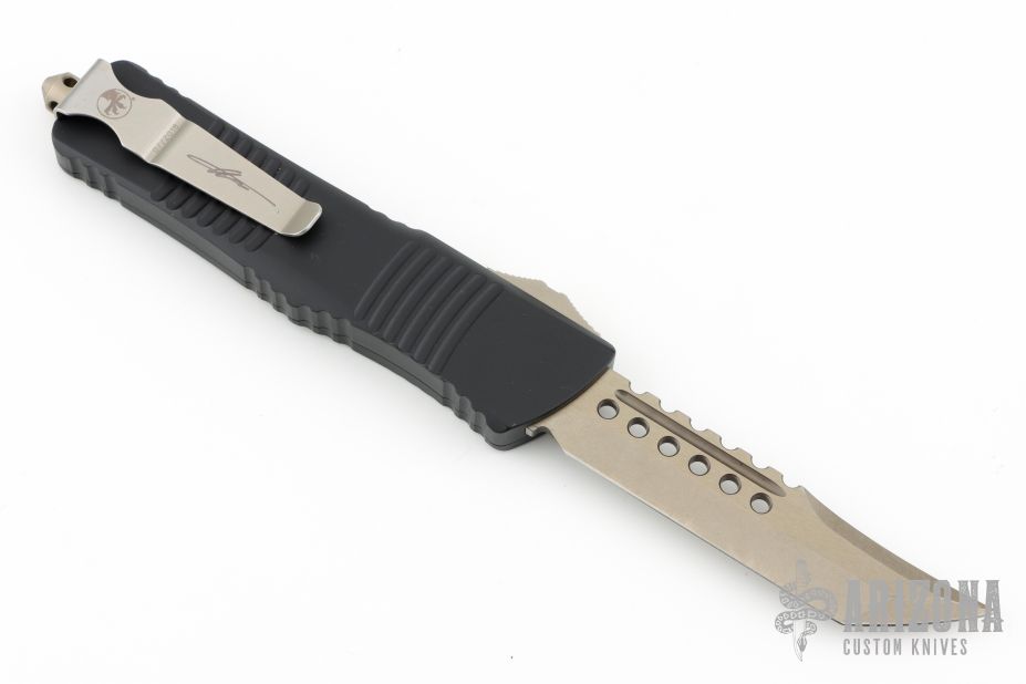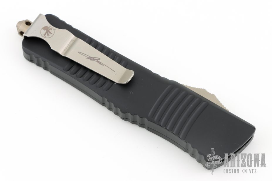 This Combat Troodon by Microtech Knives features a bronzed Hellhound blade with satin flats. The handle has a black aluminum frame with tip down bronzed stainless steel clip and hardware. Comes with original box and papers. 07/2018. Has a few light scuffs, otherwise excellent condition.