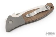 This custom CQC-11 by Emerson Knives features a hand-ground satin finish blade, bead blast titanium dovetailed bolsters and liners, green canvas micarta scales, black G-10 backspacer, tip up stainless steel clip. Notched thumbrest. Wave feature and thumbdisc. Nice blade seating, lockup and detent. Has a couple light scuffs, otherwise excellent condition. Comes with original box and papers.