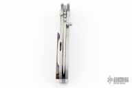 This Framelock Folder by Ema Forge features a high satin finished blade with single thumbstud. The handle has a stainless Damascus frame with a timascus backspacer and tip up clip. Comes with a Velcro case, original box and card. Nice detent, lockup and blade steating. New from maker.