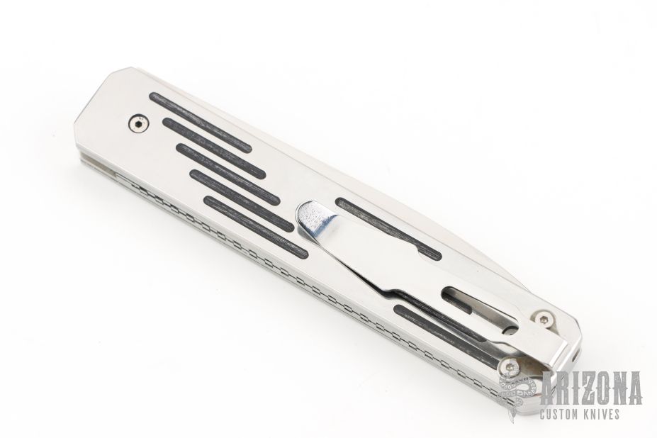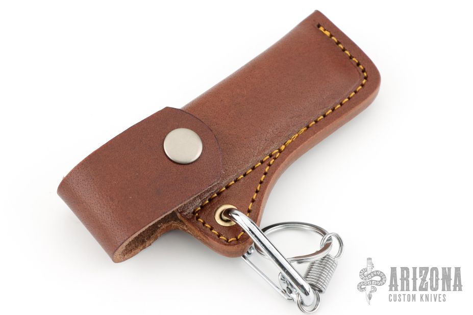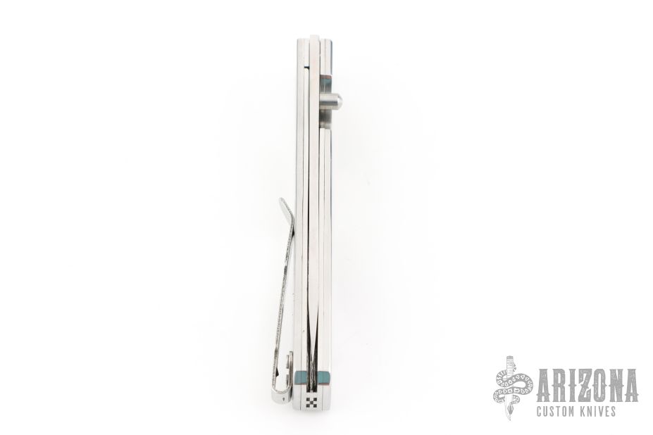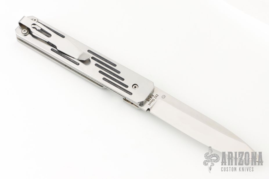 This linerlock by EMA Forge features a high satin finished blade with single thumbstud. The handle has stainless steel scales with black wood inlays, stainless steel liners and checkered backspacer, stainless steel tip up clip. Nice lockup. Comes with a brown leather sheath and original box. New from maker.