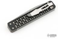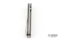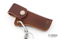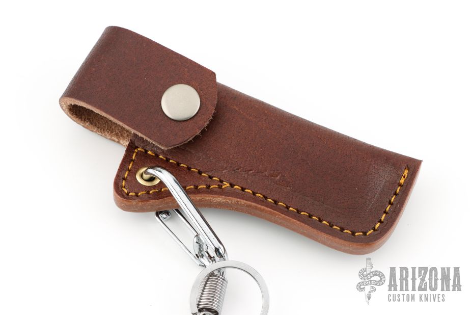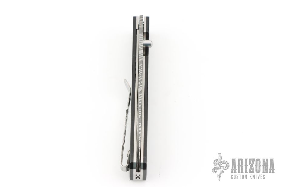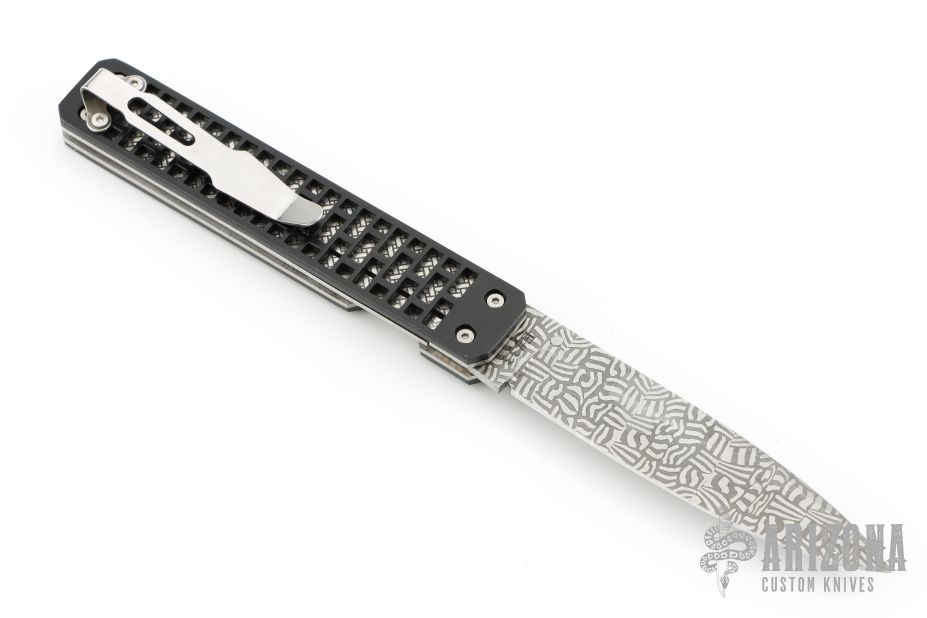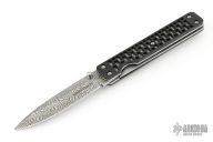 This linerlock by EMA Forge features a Mosaic Damascus blade with single thumbstud. The handle has black titanium scales, stainless steel liners and checkered backspacer, stainless steel tip up clip. Nice lockup. Comes with a brown leather sheath and original box. New from maker.