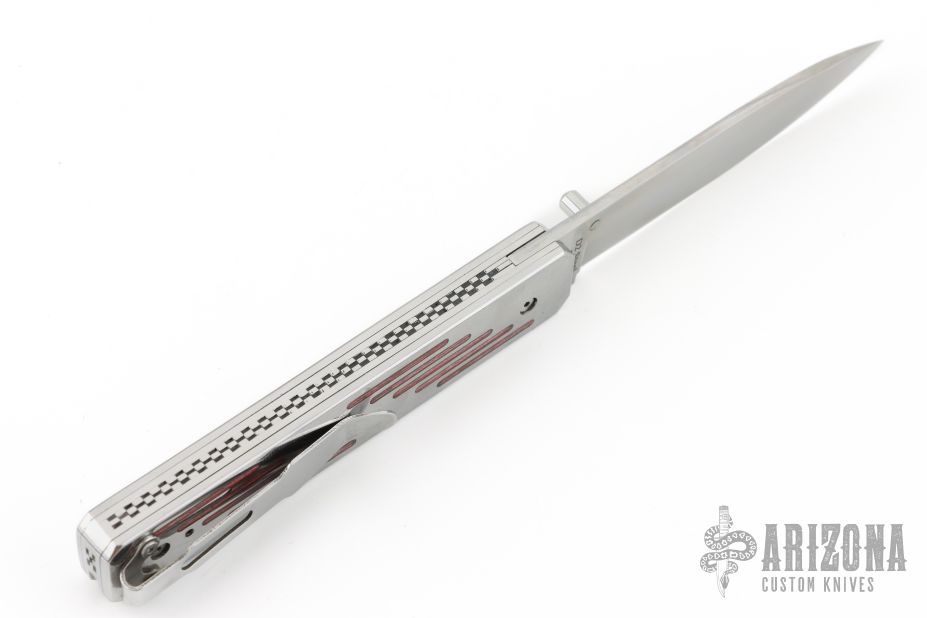 This linerlock by EMA Forge features a high satin finished blade with single thumbstud. The handle has stainless steel scales with red wood inlays, stainless steel liners and checkered backspacer, stainless steel tip up clip. Nice lockup. Comes with a brown leather sheath and original box. New from maker.