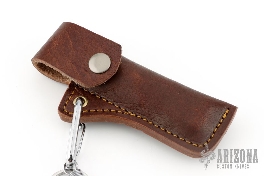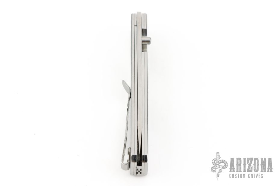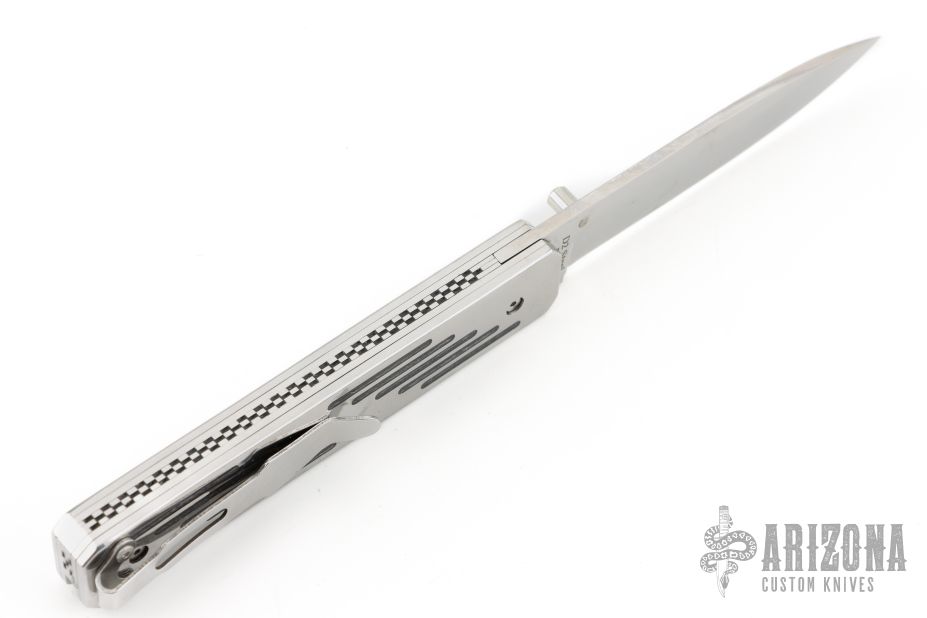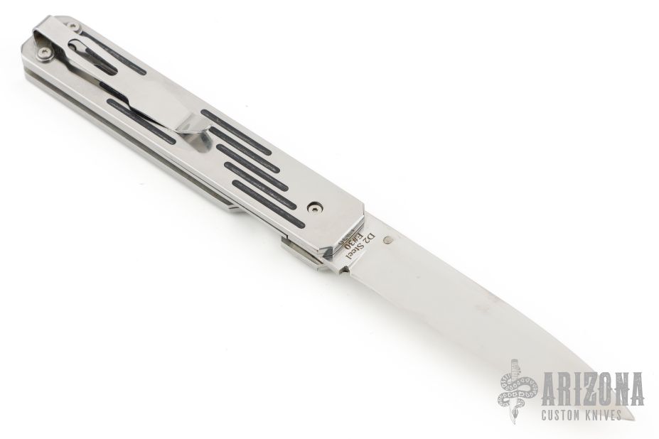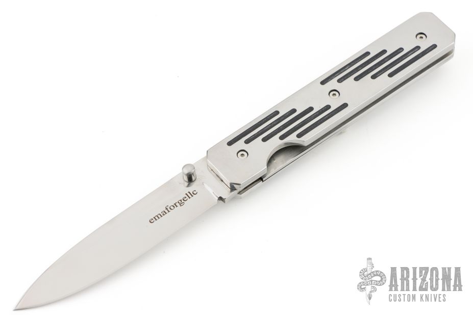 This linerlock by EMA Forge features a high satin finished blade with single thumbstud. The handle has stainless steel scales with black wood inlays, stainless steel liners and checkered backspacer, stainless steel tip up clip. Nice lockup. Comes with a brown leather sheath and original box. New from maker.