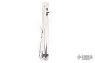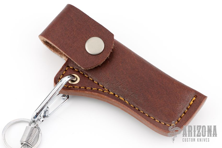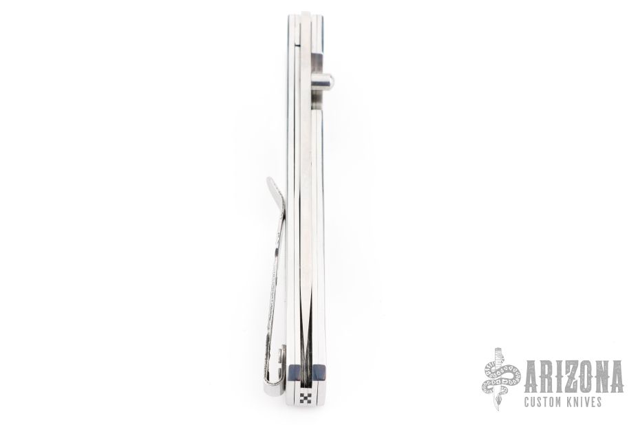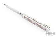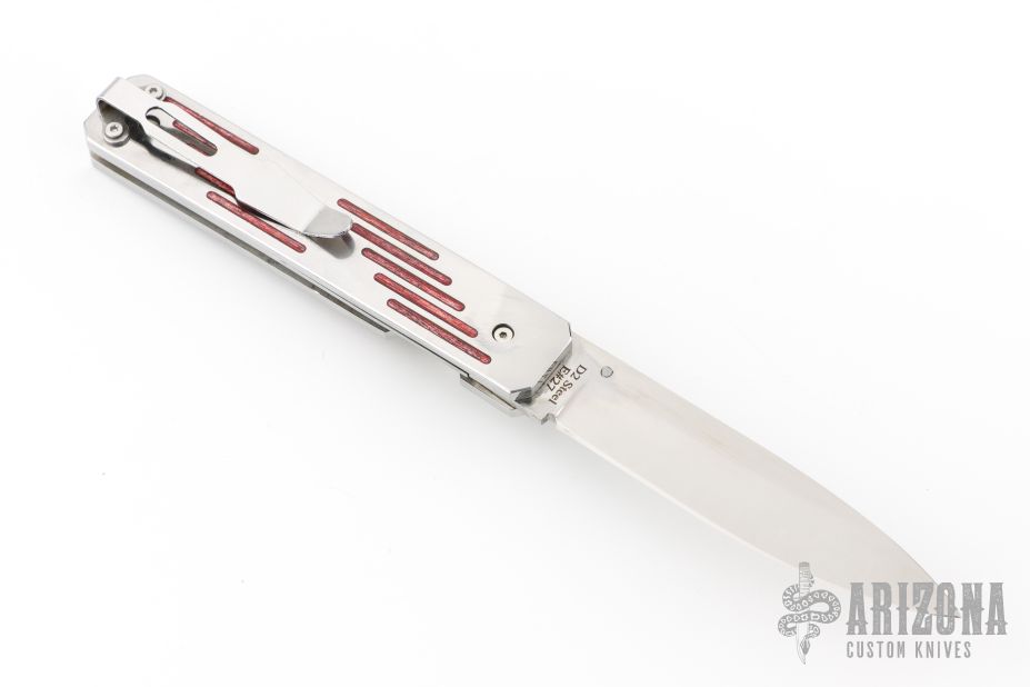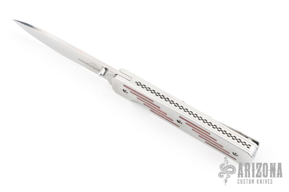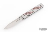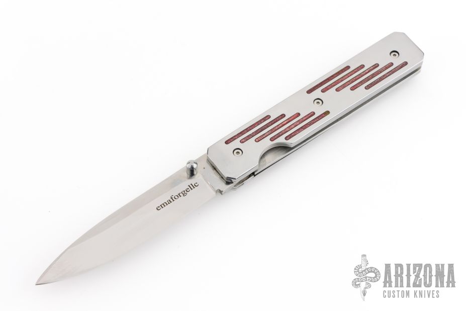 This linerlock by EMA Forge features a high satin finished blade with single thumbstud. The handle has stainless steel scales with red wood inlays, stainless steel liners and checkered backspacer, stainless steel tip up clip. Nice lockup. Comes with a brown leather sheath and original box. New from maker.