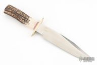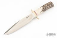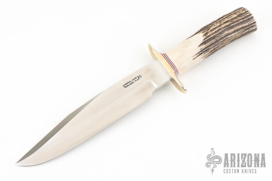 This Model 14 CDT by Randall Made Knives features a clip point satin finished blade with a sharpened top edge, .212" blade stock and 1.480" blade depth, hidden tang construction. The handle has a nickel silver guard, stag grip, red/white/blue spacers. Cut Down hidden tang. This knife was designed to meet the demand for an almost indestructible all-purpose knife, though it is especially suited for combat and survival purposes. Excellent condition. Comes with a zippered case.