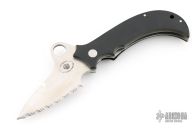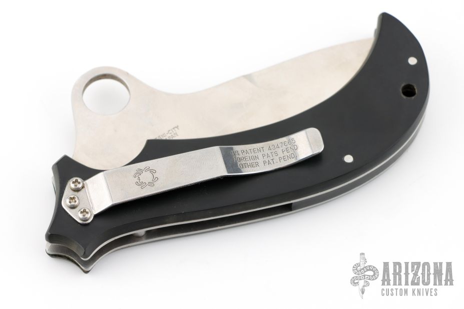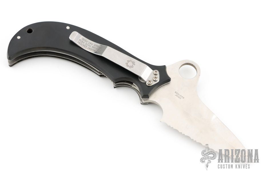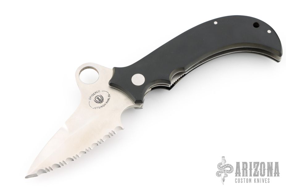 This knife by Spyderco is a Jotsingh Khalsa design, it features a satin finished fully serrated blade with a thumb hole. The handle has black paper micarta scales, stainless steel liners and a stainless steel tip down clip. Nice detent and blade seating. Lockup is a little late. Has a couple light scuffs, excellent condition otherwise.