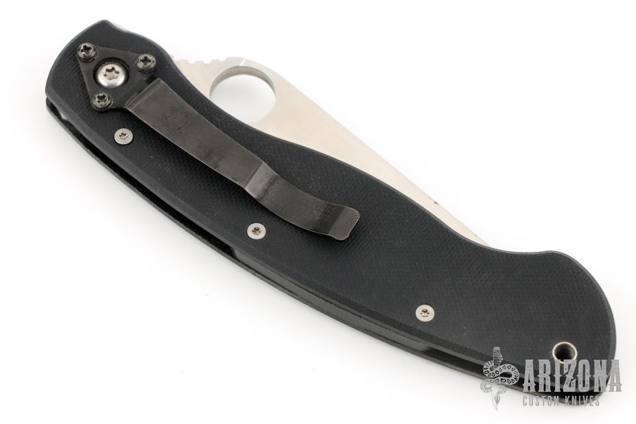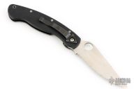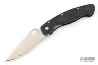This Military folder by Spyderco has a satin finished fully serrated blade with thumbhole. The handle has black G-10 scales with an inlaid stainless steel liner lock. Has some light scuffs and scratches. Has a little rusting on the blade. Great condition otherwise.