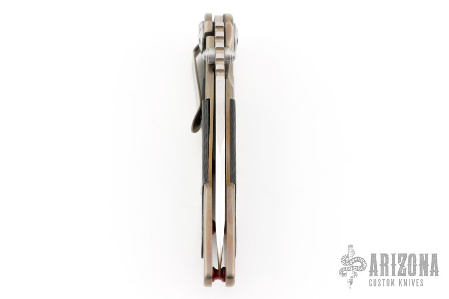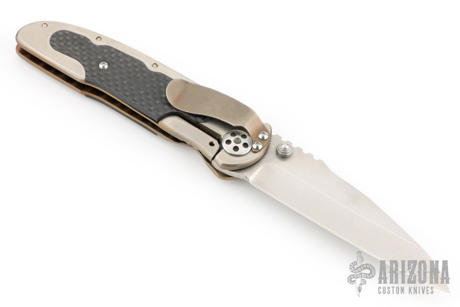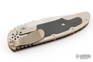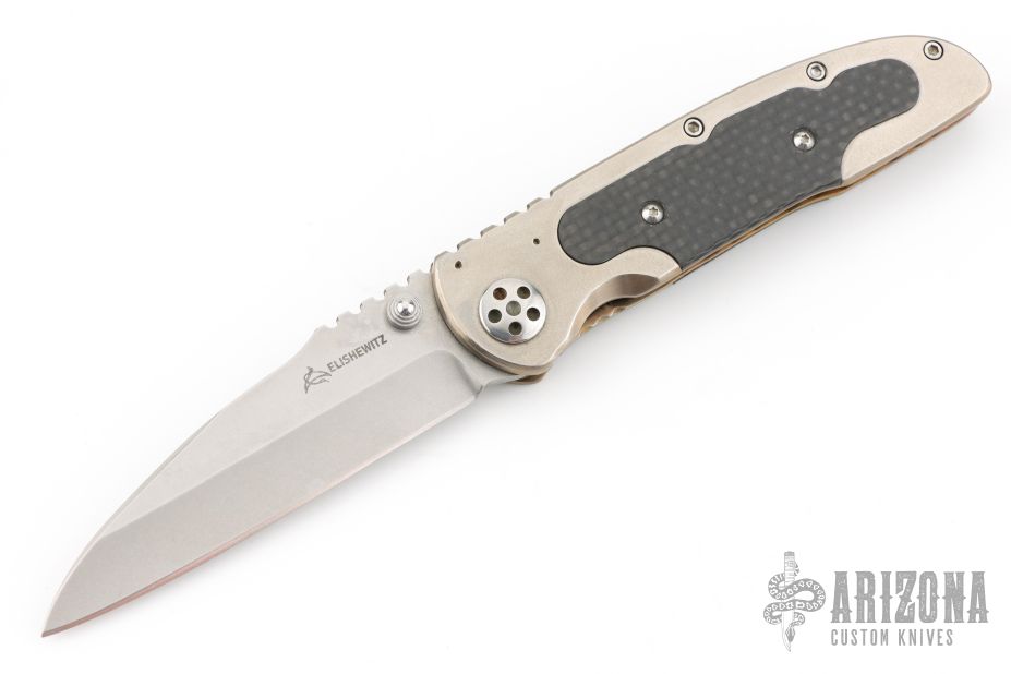 This Cortex by Allen Elishewitz features a hand rub satin finished blade with dual thumb studs and a notched thumbrest. The handle has a two-tone titanium frame with carbon fiber inlays and a tip down stainless steel clip. Strong lock up, nice blade seating and detent. Has a couple light scratches, excellent condition otherwise.