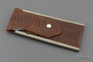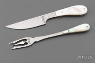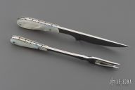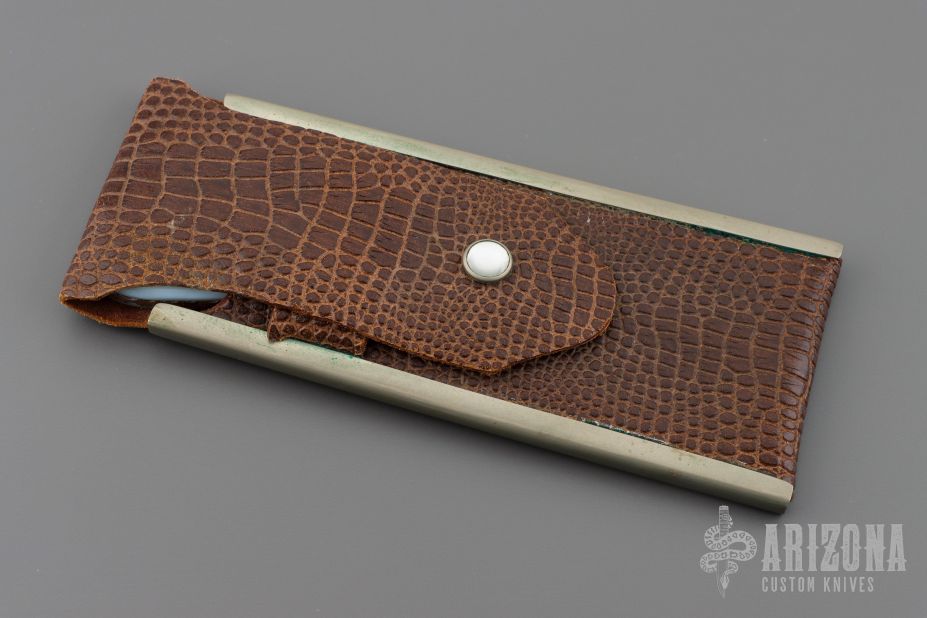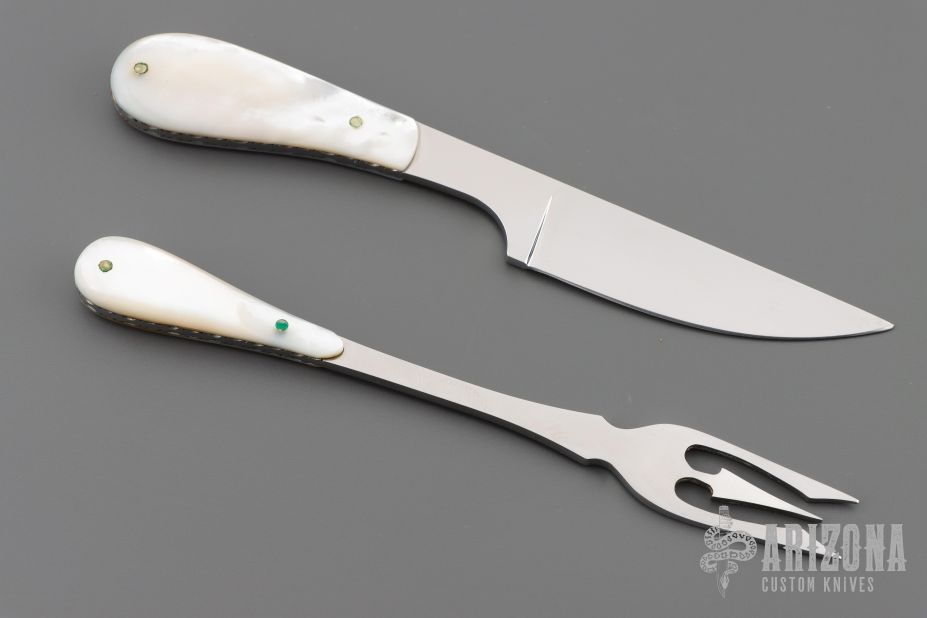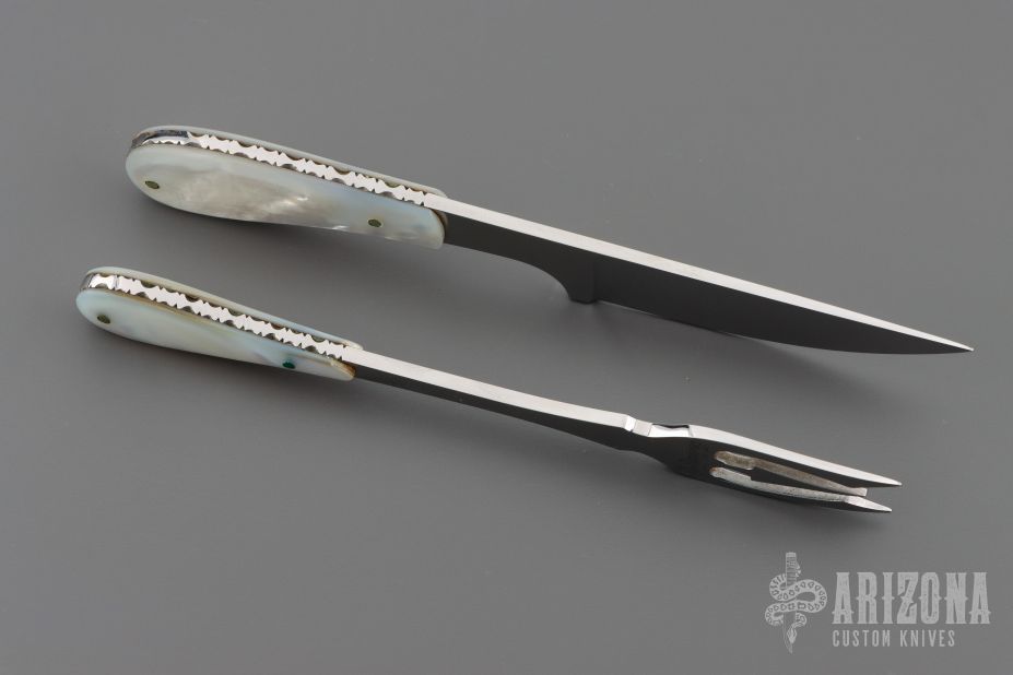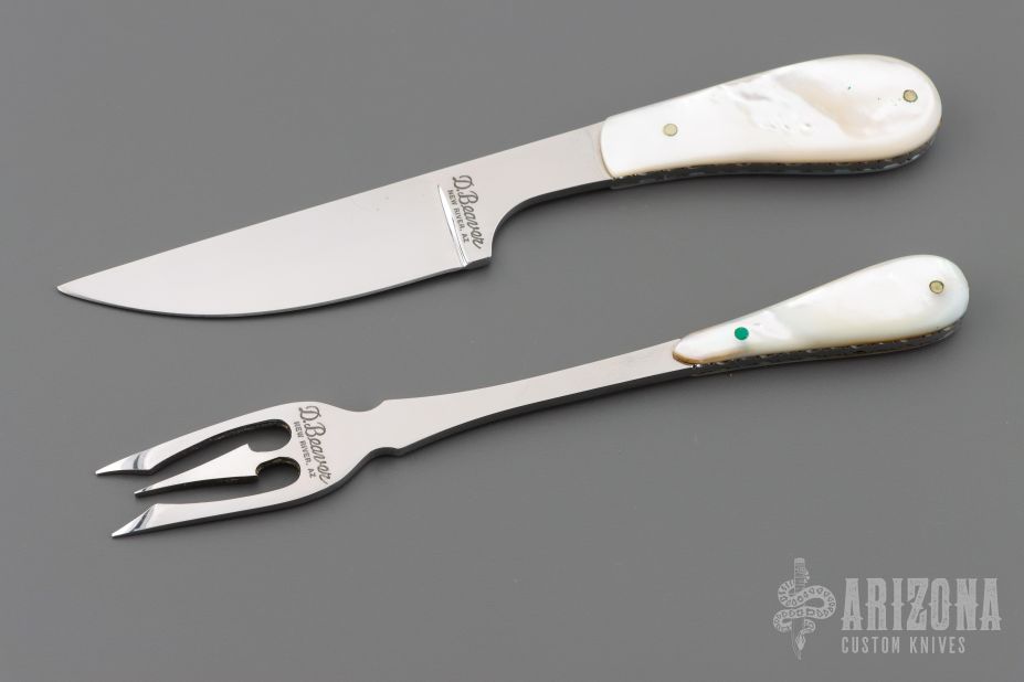 This Knife and Fork set by Devon Butch Beaver features a knife with a mirror polished blade, .123" blade stock and .796" blade depth, full tang construction. The handle has mother of pearl scales, nickel silver pins, fileworked tang. The fork is made to match. Both come in a brown leather case with nickel silver fittings. Comes with a zippered case. Excellent condition.