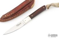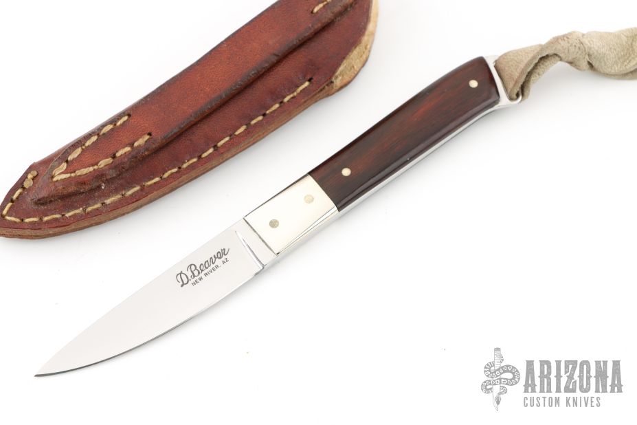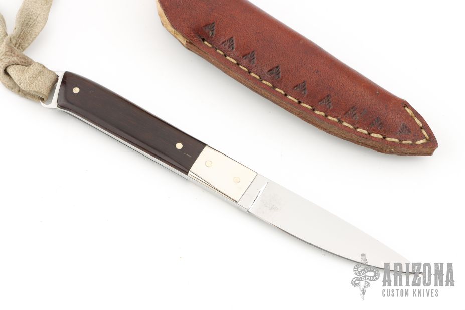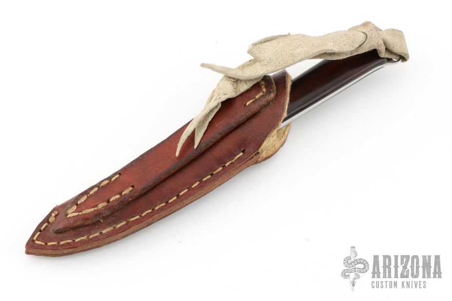 This knife by Devon Butch Beaver features a mirror finished blade with .125" blade stock and .553" blade depth, full tapered tang construction. The handle has snickel silver bolsters, wood scales. Comes with a brown leather sheath. Excellent condition. Comes with a zippered case.