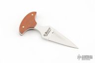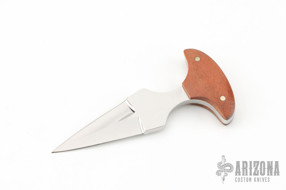 This push dagger by Devon Butch Beaver features a mirror polished double edged blade with .121" blade stock and .827" blade depth, full tang construction with wood scales and nickel silver pins. Comes with a brown leather wallet sheath. Excellent condition.