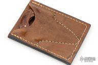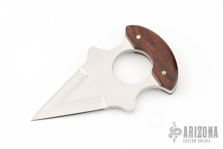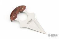 This push dagger by Devon Butch Beaver features a mirror polished double edged blade with .101" blade stock and 1.182" blade depth, full tang construction with rosewood scales and nickel silver pins. Comes with a brown leather wallet sheath. Excellent condition.