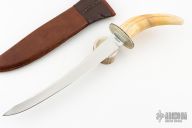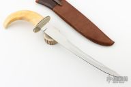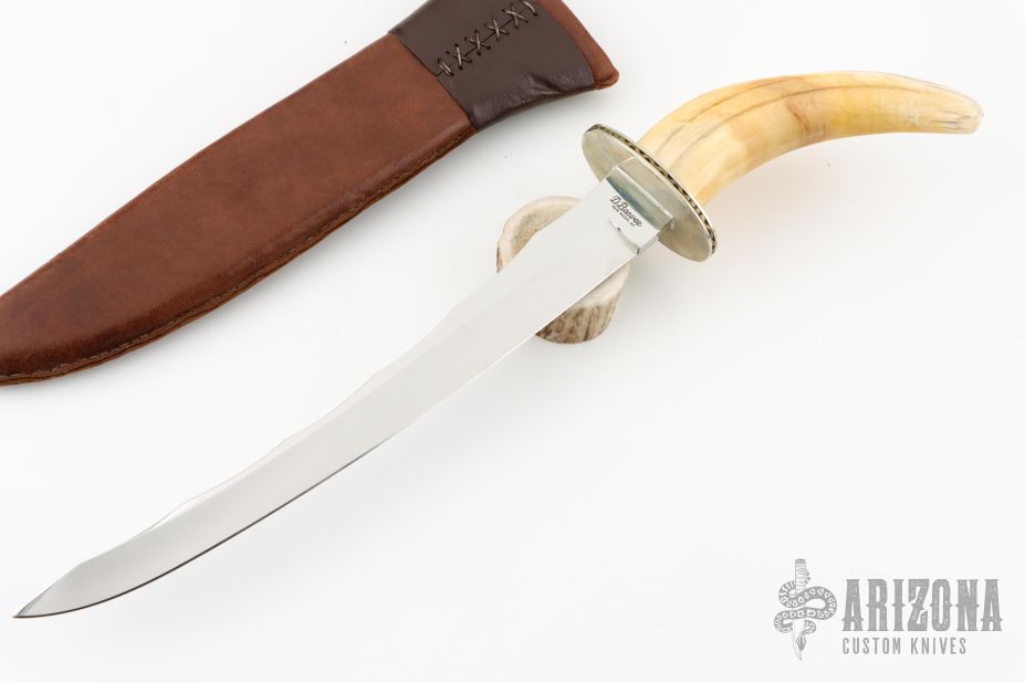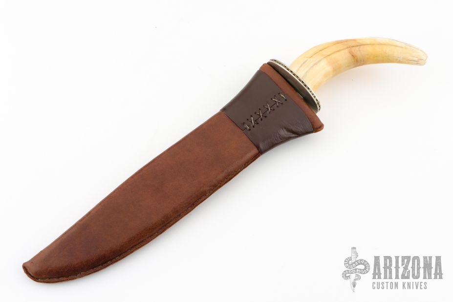 This knife by Devon Butch Beaver features mirror polished blade with .245" blade stock and 1.203" blade depth, hidden tang construction. The handle has nickel silver and fileworked brass guard, warthog tusk grip. Comes with a brown leather sheath and a zippered case. Excellent condition.